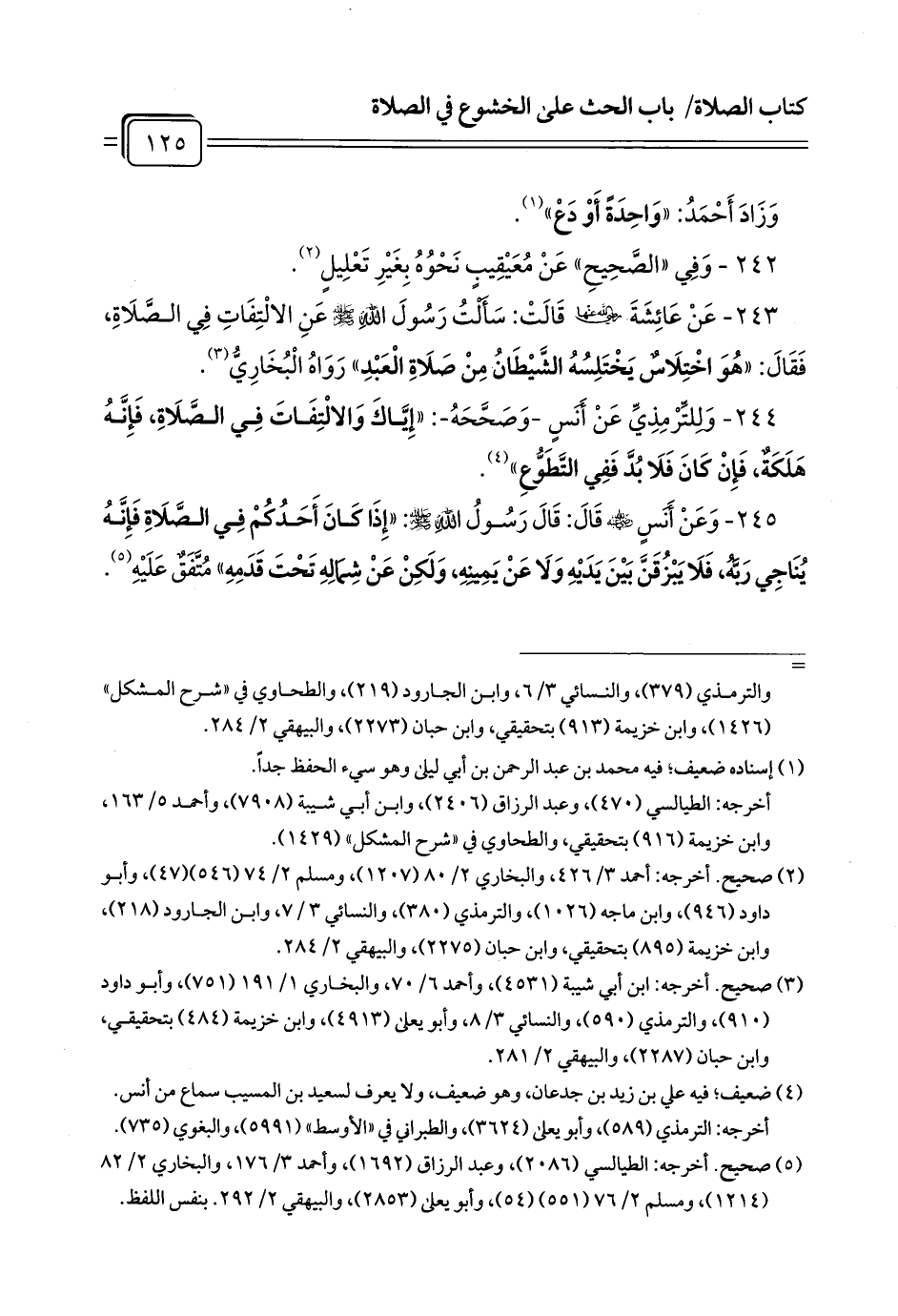 244 - وَلِلتِّرْمِذِيِّ عَنْ أَنَسٍ -وَصَحَّحَهُ-: «إِيَّاكَ وَالالْتِفَاتَ فِي الصَّلَاةِ، فَإِنَّهُ هَلَكَةٌ، فَإِنْ كَانَ فَلَا بُدَّ فَفِي التَّطَوُّعِ» (¬1).