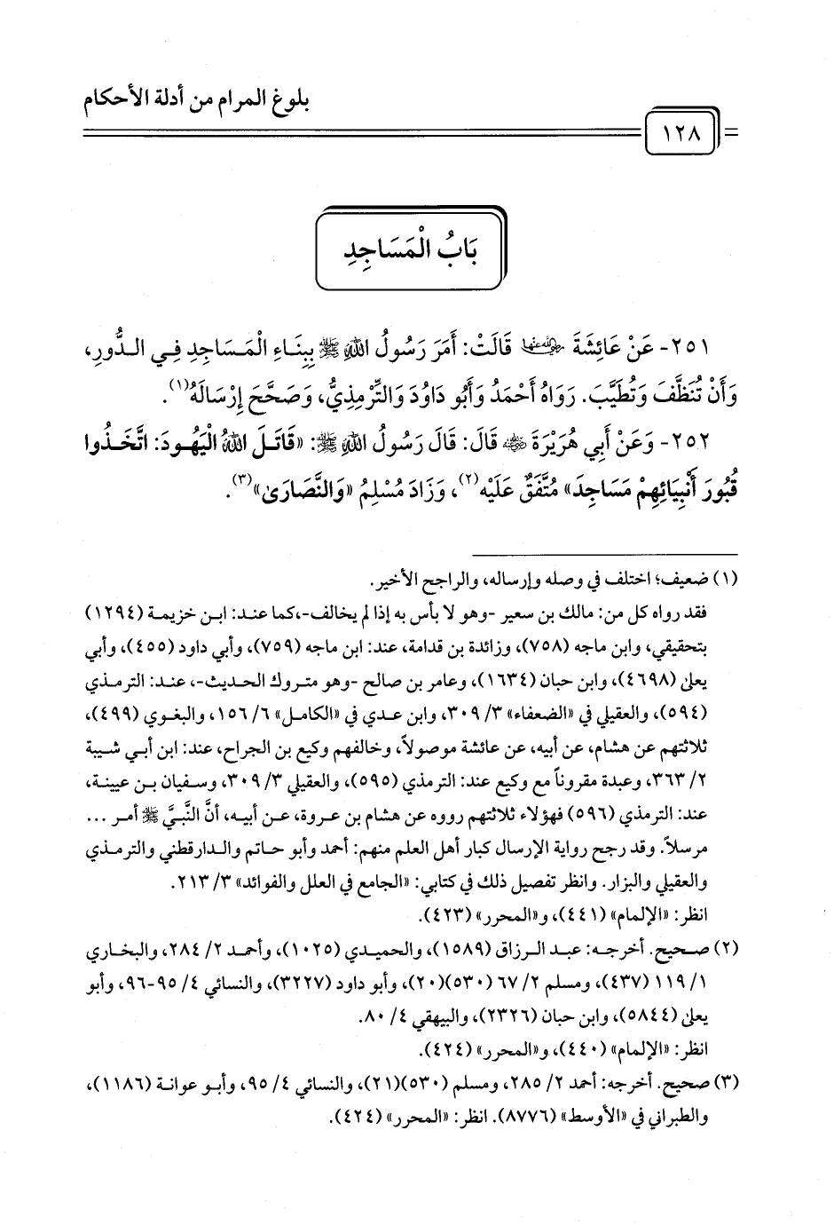 251 - عَنْ عَائِشَةَ -رَضِيَ اللَّهُ عَنْهَا- قَالَتْ: أَمَرَ رَسُولُ اللَّهِ - صلى الله عليه وسلم - بِبِنَاءِ الْمَسَاجِدِ فِي الدُّورِ، وَأَنْ تُنَظَّفَ وَتُطَيَّبَ. رَوَاهُ أَحْمَدُ وَأَبُو دَاوُدَ وَالتِّرْمِذِيُّ، وَصَحَّحَ إِرْسَالَهُ (¬1).