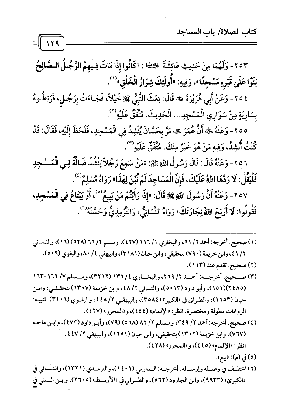253 - وَلَهُمَا مِنْ حَدِيثِ عَائِشَةَ رَضِيَ اللَّهُ عَنْهَا: «كَانُوا إِذَا مَاتَ فِيهِمْ الرَّجُلُ الصَّالِحُ بَنَوْا عَلَى قَبْرِهِ مَسْجِدًا»، وَفِيهِ: «أُولَئِكَ شِرَارُ الْخَلْقِ» (¬1).