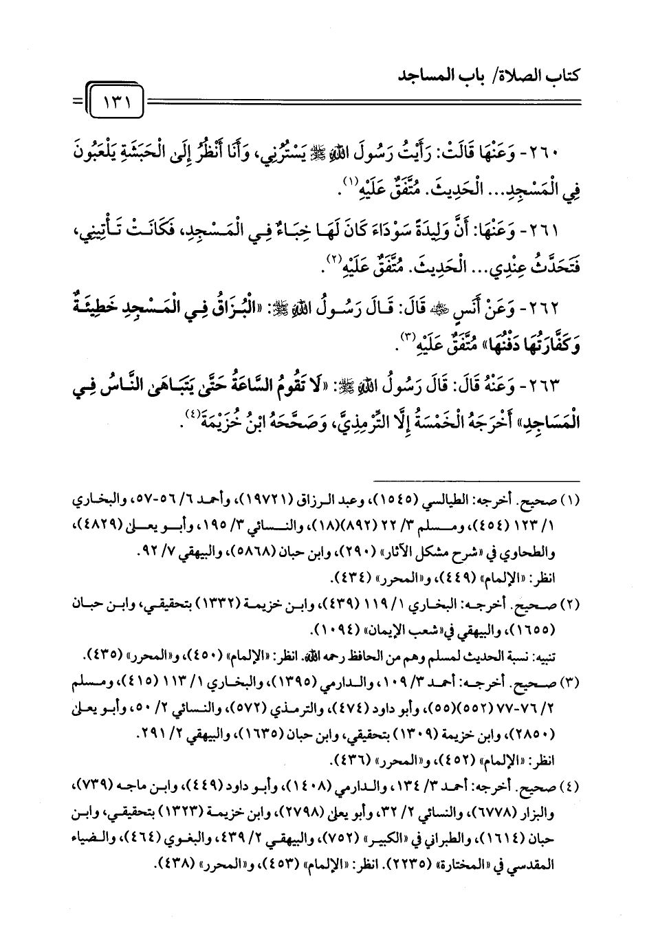 260 - وَعَنْهَا قَالَتْ: رَأَيْتُ رَسُولَ اللَّهِ - صلى الله عليه وسلم - يَسْتُرُنِي، وَأَنَا أَنْظُرُ إِلَى الْحَبَشَةِ يَلْعَبُونَ فِي الْمَسْجِدِ ... الْحَدِيثَ. مُتَّفَقٌ عَلَيْهِ (¬1).
