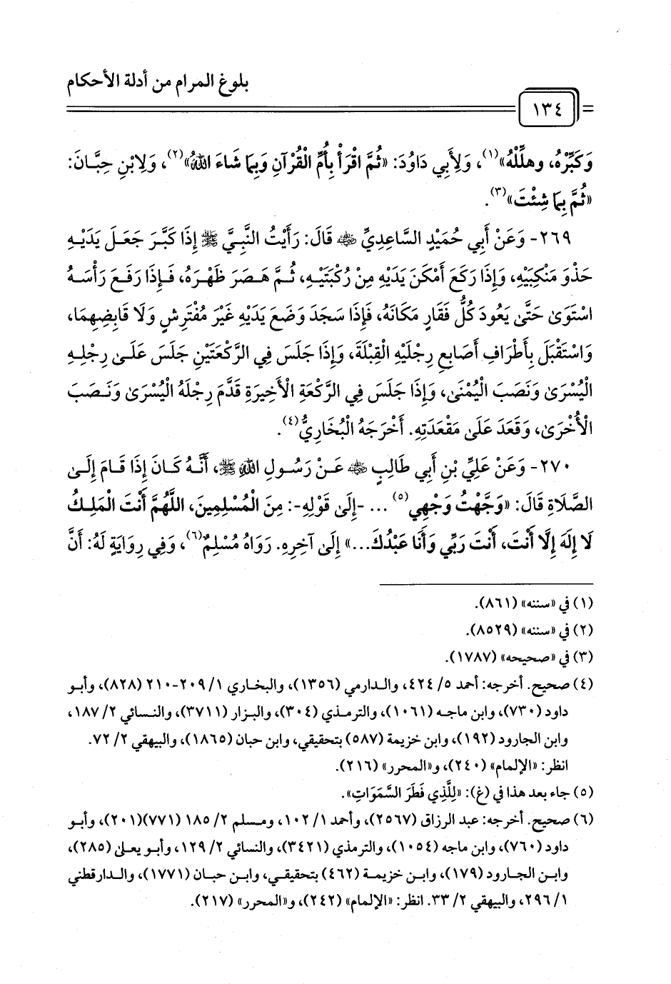 269 - وَعَنْ أَبِي حُمَيْدٍ السَّاعِدِيِّ - رضي الله عنه - قَالَ: رَأَيْتُ النَّبِيَّ - صلى الله عليه وسلم - إِذَا كَبَّرَ جَعَلَ يَدَيْهِ حَذْوَ مَنْكِبَيْهِ، وَإِذَا رَكَعَ أَمْكَنَ يَدَيْهِ مِنْ رُكْبَتَيْهِ، ثُمَّ هَصَرَ ظَهْرَهُ، فَإِذَا رَفَعَ رَأْسَهُ اسْتَوَى حَتَّى يَعُودَ كُلُّ فَقَارٍ مَكَانَهُ، فَإِذَا سَجَدَ وَضَعَ يَدَيْهِ غَيْرَ مُفْتَرِشٍ وَلَا قَابِضِهِمَا، وَاسْتَقْبَلَ بِأَطْرَافِ أَصَابِعِ رِجْلَيْهِ الْقِبْلَةَ، وَإِذَا جَلَسَ فِي الرَّكْعَتَيْنِ جَلَسَ عَلَى رِجْلِهِ الْيُسْرَى وَنَصَبَ الْيُمْنَى، وَإِذَا جَلَسَ فِي الرَّكْعَةِ الْأَخِيرَةِ قَدَّمَ رِجْلَهُ الْيُسْرَى وَنَصَبَ الْأُخْرَى، وَقَعَدَ عَلَى مَقْعَدَتِهِ. أَخْرَجَهُ الْبُخَارِيُّ (¬1).