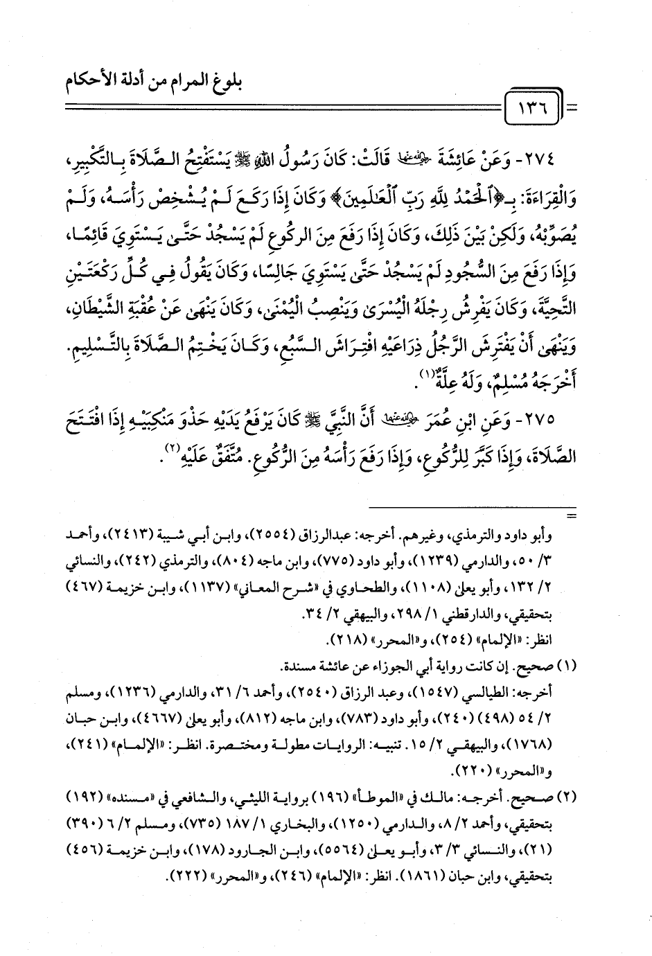 274 - وَعَنْ عَائِشَةَ -رَضِيَ اللَّهُ عَنْهَا- قَالَتْ: كَانَ رَسُولُ اللَّهِ - صلى الله عليه وسلم - يَسْتَفْتِحُ الصَّلَاةَ بِالتَّكْبِيرِ، وَالْقِرَاءَةَ: بِـ {الْحَمْدُ لِلَّهِ رَبِّ الْعَالَمِينَ} وَكَانَ إِذَا رَكَعَ لَمْ يُشْخِصْ رَأْسَهُ، وَلَمْ يُصَوِّبْهُ، وَلَكِنْ بَيْنَ ذَلِكَ، وَكَانَ إِذَا رَفَعَ مِنَ الركُوعِ لَمْ يَسْجُدْ حَتَّى يَسْتَوِيَ قَائِمًا، وَإِذَا رَفَعَ مِنَ السُّجُودِ لَمْ يَسْجُدْ حَتَّى يَسْتَوِيَ جَالِسًا، وَكَانَ يَقُولُ فِي كُلِّ رَكْعَتَيْنِ التَّحِيَّةَ، وَكَانَ يَفْرِشُ رِجْلَهُ الْيُسْرَى وَيَنْصِبُ الْيُمْنَى، وَكَانَ يَنْهَى عَنْ عُقْبَةِ الشَّيْطَانِ، وَيَنْهَى أَنْ يَفْتَرِشَ الرَّجُلُ ذِرَاعَيْهِ افْتِرَاشَ السَّبُعِ، وَكَانَ يَخْتِمُ الصَّلَاةَ بِالتَّسْلِيمِ. أَخْرَجَهُ مُسْلِمٌ، وَلَهُ عِلَّةٌ (¬1).
