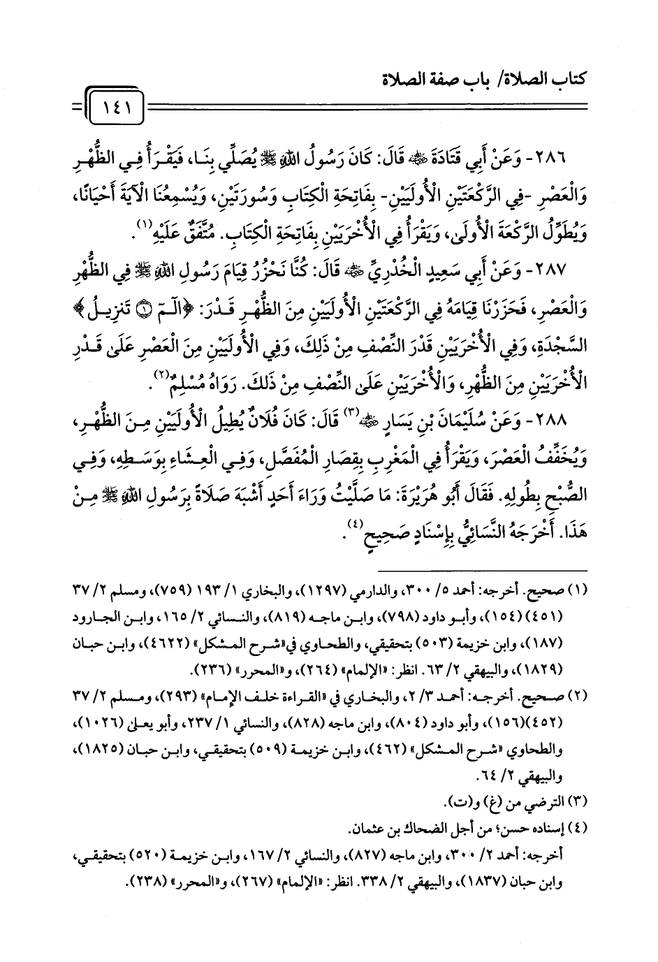 287 - وَعَنْ أَبِي سَعِيدٍ الْخُدْرِيِّ - رضي الله عنه - قَالَ: كُنَّا نَحْزُرُ قِيَامَ رَسُولِ اللَّهِ - صلى الله عليه وسلم - فِي الظُّهْرِ وَالْعَصْرِ، فَحَزَرْنَا قِيَامَهُ فِي الرَّكْعَتَيْنِ الْأُولَيَيْنِ مِنَ الظُّهْرِ قَدْرَ: {الم تَنْزِيلُ} السَّجْدَةِ، وَفِي الْأُخْرَيَيْنِ قَدْرَ النِّصْفِ مِنْ ذَلِكَ، وَفِي الْأُولَيَيْنِ مِنَ الْعَصْرِ عَلَى قَدْرِ الْأُخْرَيَيْنِ مِنَ الظُّهْرِ، وَالْأُخْرَيَيْنِ عَلَى النِّصْفِ مِنْ ذَلكَ. رَوَاهُ مُسْلِمٌ (¬1).