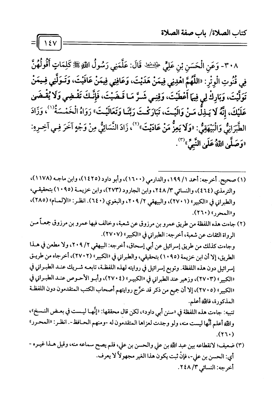308 - وَعَنِ الْحَسَنِ بْنِ عَلِيٍّ رَضِيَ اللَّهُ عَنْهُمَا قَالَ: عَلَّمَنِي رَسُولُ اللَّهِ - صلى الله عليه وسلم - كَلِمَاتٍ أَقُولُهُنَّ فِي قُنُوتِ الْوِتْرِ: «اللَّهُمَّ اهْدِنِي فِيمَنْ هَدَيْتَ، وَعَافِنِي فِيمَنْ عَافَيْتَ، وَتَوَلَّنِي فِيمَنْ تَوَلَّيْتَ، وَبَارِكْ لِي فِيمَا أَعْطَيْتَ، وَقِنِي شَرَّ مَا قَضَيْتَ، فَإِنَّكَ تَقْضِي وَلَا يُقْضَى عَلَيْكَ، إِنَّهُ لَا يَذِلُّ مَنْ وَالَيْتَ، تَبَارَكْتَ رَبَّنَا وَتَعَالَيْتَ» رَوَاهُ الْخَمْسَةُ (¬1)، وَزَادَ الطَّبَرَانِيُّ وَالْبَيْهَقِيُّ: «وَلَا يَعِزُّ مَنْ عَادَيْتَ» (¬2)،