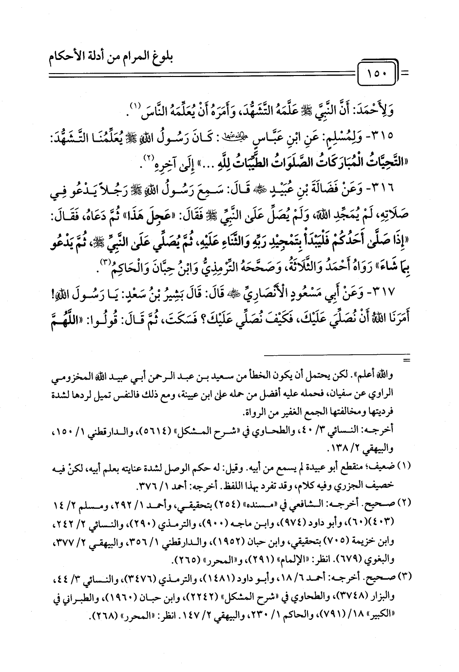 315 - وَلِمُسْلِمٍ: عَنِ ابْنِ عَبَّاسٍ رَضِيَ اللهُ عَنْهُمَا: كَانَ رَسُولُ اللَّهِ - صلى الله عليه وسلم - يُعَلِّمُنَا التَّشَهُّدَ: «التَّحِيَّاتُ الْمُبَارَكَاتُ الصَّلَوَاتُ الطَّيِّبَاتُ لِلَّهِ ...» إِلَى آخِرِهِ (¬1).