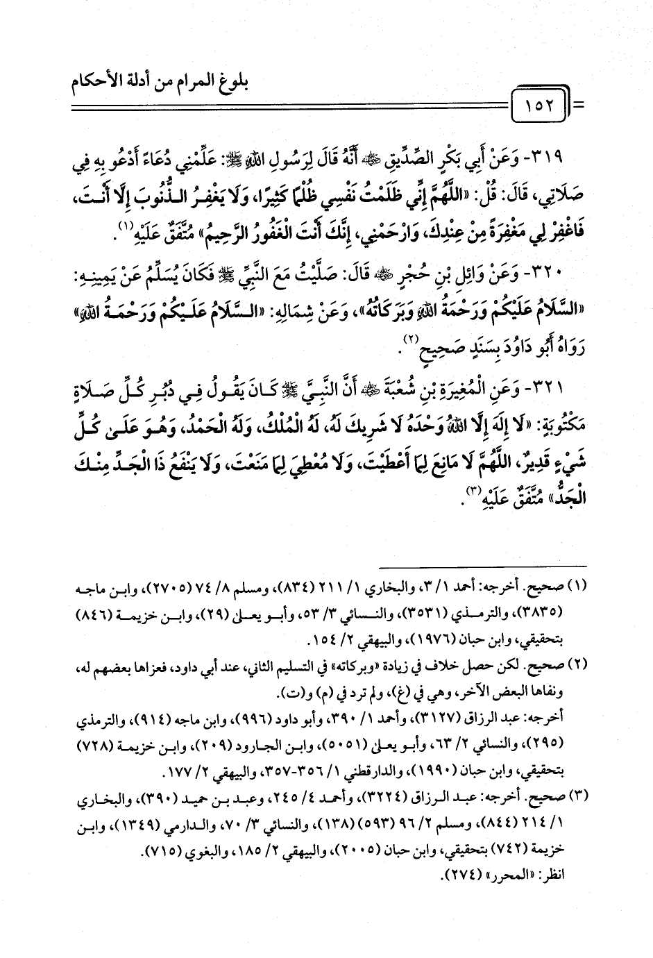 321 - وَعَنِ الْمُغِيرَةِ بْنِ شُعْبَةَ - رضي الله عنه - أَنَّ النَّبِيَّ - صلى الله عليه وسلم - كَانَ يَقُولُ فِي دُبُرِ كُلِّ صَلَاةٍ مَكْتُوبَةٍ: «لَا إِلَهَ إِلَّا اللَّهُ وَحْدَهُ لَا شَرِيكَ لَهُ، لَهُ الْمُلْكُ، وَلَهُ الْحَمْدُ، وَهُوَ عَلَى كُلِّ شَيْءٍ قَدِيرٌ، اللَّهُمَّ لَا مَانِعَ لِمَا أَعْطَيْتَ، وَلَا مُعْطِيَ لِمَا مَنَعْتَ، وَلَا يَنْفَعُ ذَا الْجَدِّ مِنْكَ الْجَدُّ» مُتَّفَقٌ عَلَيْهِ (¬1).