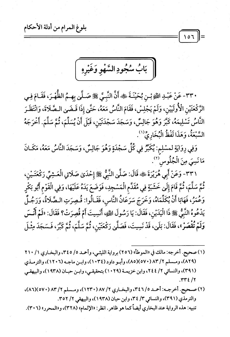 331 - وَعَنْ أَبِي هُرَيْرَةَ - رضي الله عنه - قَالَ: صَلَّى النَّبِيُّ - صلى الله عليه وسلم - إِحْدَى صَلَاتي الْعَشِيِّ رَكْعَتَيْنِ، ثُمَّ سَلَّمَ، ثُمَّ قَامَ إِلَى خَشَبَةٍ فِي مُقَدَّمِ الْمَسْجِدِ، فَوَضَعَ يَدَهُ عَلَيْهَا، وَفِي الْقَوْمِ أَبُو بَكْرٍ وَعُمَرُ، فَهَابَا أَنْ يُكَلِّمَاهُ، وَخَرَجَ سَرَعَانُ النَّاسِ، فَقَالُوا: قُصِرَتِ الصَّلَاةُ، وَرَجُلٌ يَدْعُوهُ النَّبِيُّ - صلى الله عليه وسلم - ذَا الْيَدَيْنِ، فَقَالَ: يَا رَسُولَ اللَّهِ، أَنَسِيتَ أَمْ قُصِرَتْ؟ فَقَالَ: «لَمْ أَنْسَ وَلَمْ تُقْصَرْ»، فَقَالَ: بَلَى، قَدْ نَسِيتَ، فَصَلَّى رَكْعَتَيْنِ، ثُمَّ سَلَّمَ، ثُمَّ كَبَّرَ، فَسَجَدَ مِثْلَ