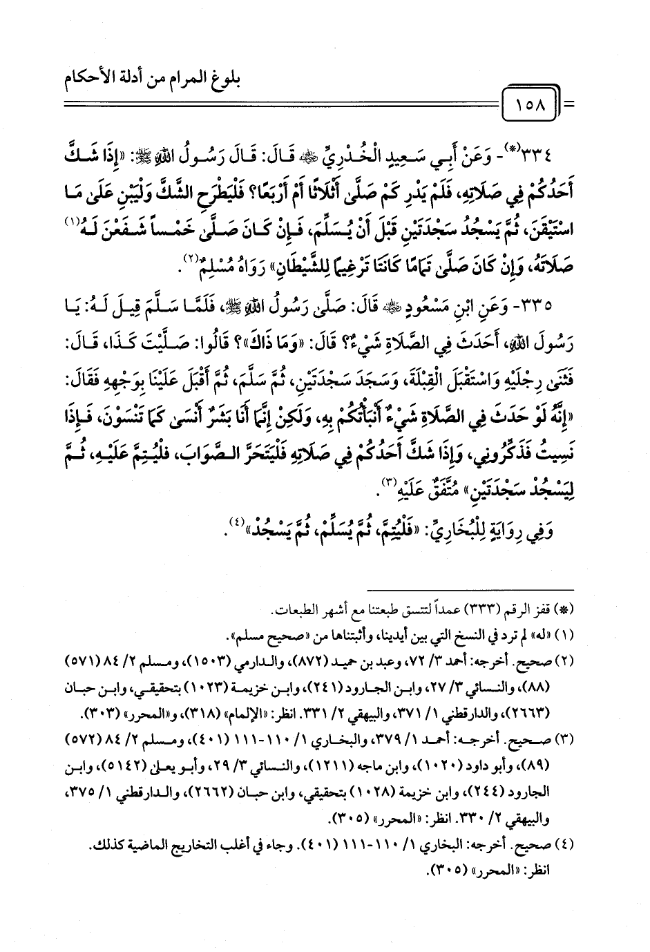 334 - وَعَنْ أَبِي سَعِيدٍ الْخُدْرِيِّ - رضي الله عنه - قَالَ: قَالَ رَسُولُ اللَّهِ - صلى الله عليه وسلم -: «إِذَا شَكَّ أَحَدُكُمْ فِي صَلَاتِهِ، فَلَمْ يَدْرِ كَمْ صَلَّى أَثْلَاثًا أَمْ أَرْبَعًا؟ فَلْيَطْرَحِ الشَّكَّ وَلْيَبْنِ عَلَى مَا اسْتَيْقَنَ، ثُمَّ يَسْجُدُ سَجْدَتَيْنِ قَبْلَ أَنْ يُسَلِّمَ، فَإِنْ كَانَ صَلَّى خَمْساً شَفَعْنَ لَهُ (¬1) صَلَاتَهُ، وَإِنْ كَانَ صَلَّى تَمَامًا كَانَتَا تَرْغِيمًا لِلشَّيْطَانِ» رَوَاهُ مُسْلِمٌ (¬2).