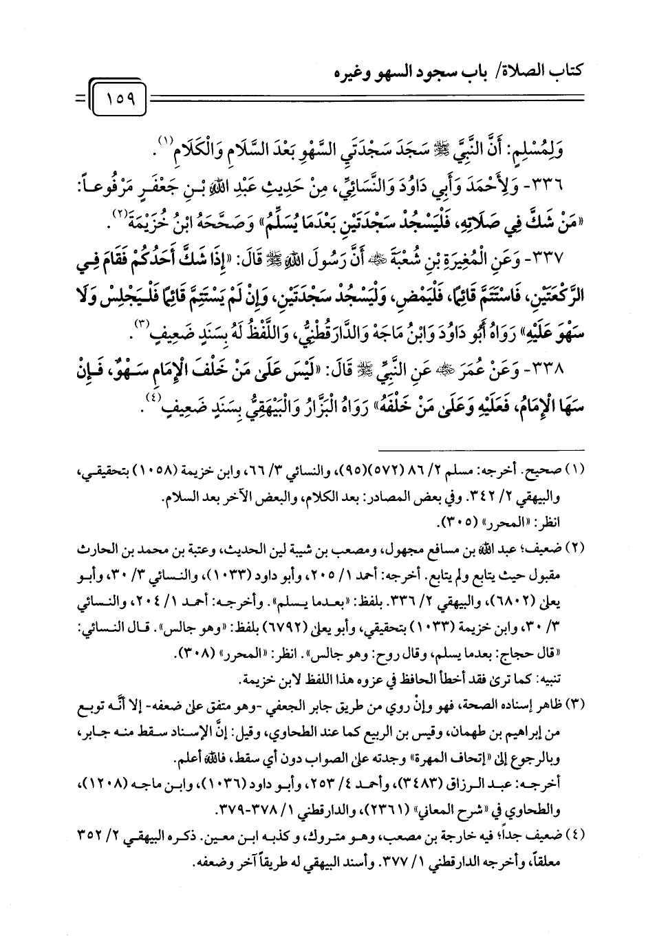 338 - وَعَنْ عُمَرَ - رضي الله عنه - عَنِ النَّبِيِّ - صلى الله عليه وسلم - قَالَ: «لَيْسَ عَلَى مَنْ خَلْفَ الْإِمَامِ سَهْوٌ، فَإِنْ سَهَا الْإِمَامُ، فَعَلَيْهِ وَعَلَى مَنْ خَلْفَهُ» رَوَاهُ الْبَزَّارُ وَالْبَيْهَقِيُّ بِسَنَدٍ ضَعِيفٍ (¬1).