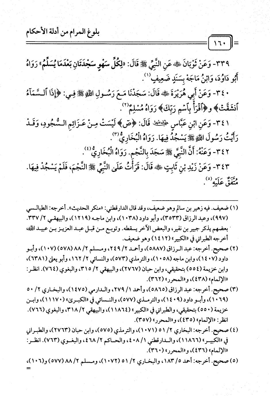 339 - وَعَنْ ثَوْبَانَ - رضي الله عنه - عَنِ النَّبِيِّ - صلى الله عليه وسلم - قَالَ: «لِكُلِّ سَهْوٍ سَجْدَتَانِ بَعْدَمَا يُسَلِّمُ» رَوَاهُ أَبُو دَاوُدَ، وَابْنُ مَاجَهْ بِسَنَدٍ ضَعِيفٍ (¬1).