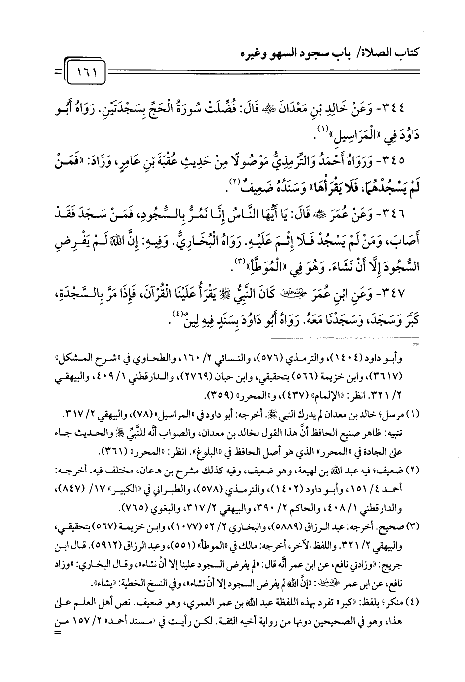 344 - وَعَنْ خَالِدِ بْنِ مَعْدَانَ - رضي الله عنه - قَالَ: فُضِّلَتْ سُورَةُ الْحَجِّ بِسَجْدَتَيْنِ. رَوَاهُ أَبُو دَاوُدَ فِي «الْمَرَاسِيلِ» (¬1).