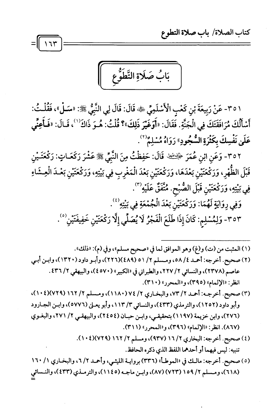 351 - عَنْ رَبِيعَةَ بْنِ كَعْبٍ الْأَسْلَمِيِّ - رضي الله عنه - قَالَ: قَالَ لِي النَّبِيُّ - صلى الله عليه وسلم -: «سَلْ»، فَقُلْتُ: أَسْأَلُكَ مُرَافَقَتَكَ فِي الْجَنَّةِ. فَقَالَ: «أَوَغَيْرَ ذَلِكَ» ? قُلْتُ: هُوَ ذَاكَ (¬1)، قَالَ: «فَأَعِنِّي عَلَى نَفْسِكَ بِكَثْرَةِ السُّجُودِ» رَوَاهُ مُسْلِمٌ (¬2).