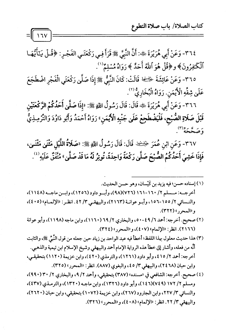 366 - وَعَنْ أَبِي هُرَيْرَةَ - رضي الله عنه - قَالَ: قَالَ رَسُولُ اللَّهِ - صلى الله عليه وسلم -: «إِذَا صَلَّى أَحَدُكُمْ الرَّكْعَتَيْنِ قَبْلَ صَلَاةِ الصُّبْحِ، فَلْيَضْطَجِعْ عَلَى جَنْبِهِ الْأَيْمَنِ» رَوَاهُ أَحْمَدُ وَأَبُو دَاوُدَ وَالتِّرْمِذِيُّ وَصَحَّحَهُ (¬1).