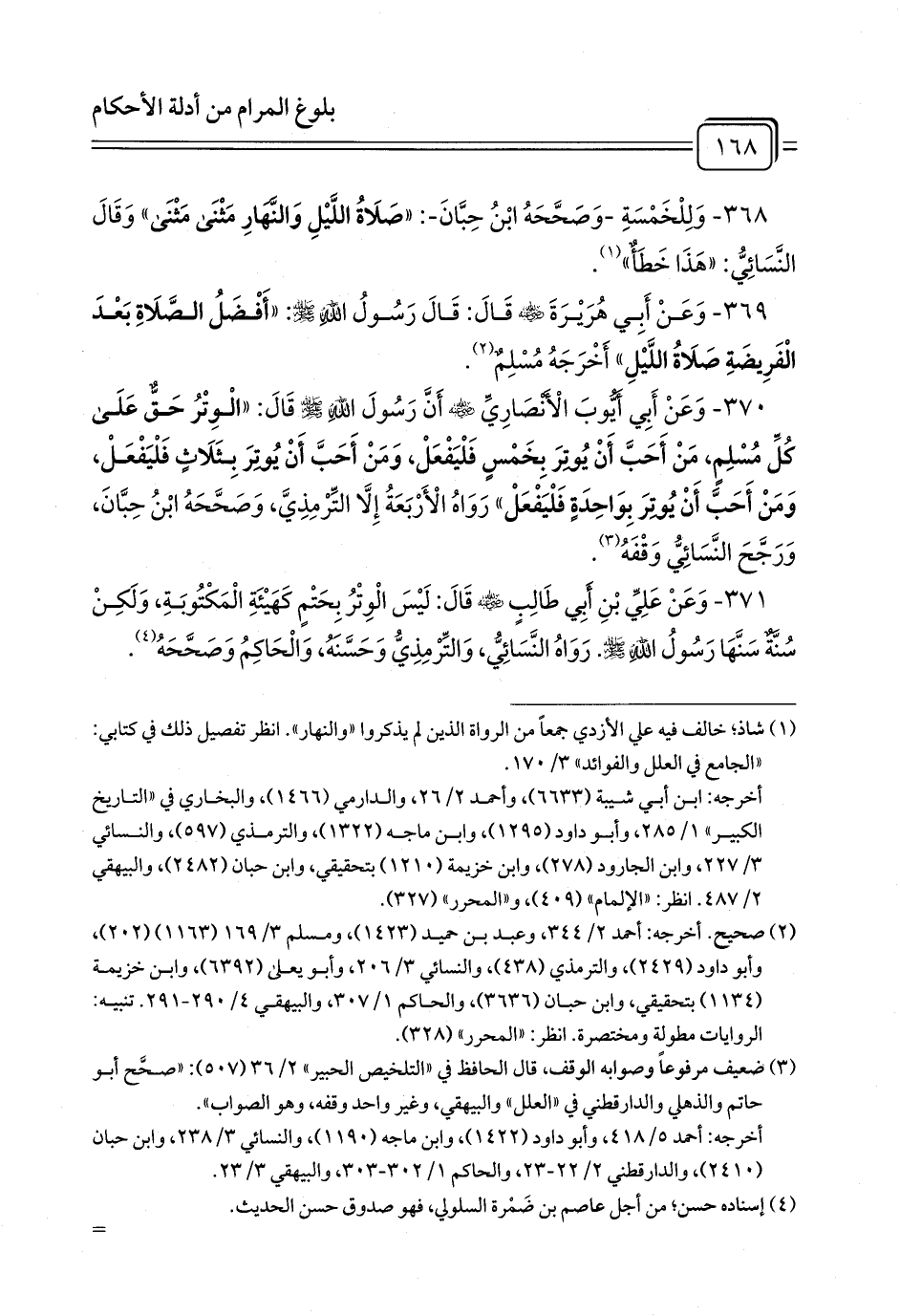 370 - وَعَنْ أَبِي أَيُّوبَ الْأَنْصَارِيِّ - رضي الله عنه - أَنَّ رَسُولَ اللَّهِ - صلى الله عليه وسلم - قَالَ: «الْوِتْرُ حَقٌّ عَلَى كُلِّ مُسْلِمٍ، مَنْ أَحَبَّ أَنْ يُوتِرَ بِخَمْسٍ فَلْيَفْعَلْ، وَمَنْ أَحَبَّ أَنْ يُوتِرَ بِثَلَاثٍ فَلْيَفْعَلْ، وَمَنْ أَحَبَّ أَنْ يُوتِرَ بِوَاحِدَةٍ فَلْيَفْعَلْ» رَوَاهُ الْأَرْبَعَةُ إِلَّا التِّرْمِذِيَّ، وَصَحَّحَهُ ابْنُ حِبَّانَ، وَرَجَّحَ النَّسَائِيُّ وَقْفَهُ (¬1).