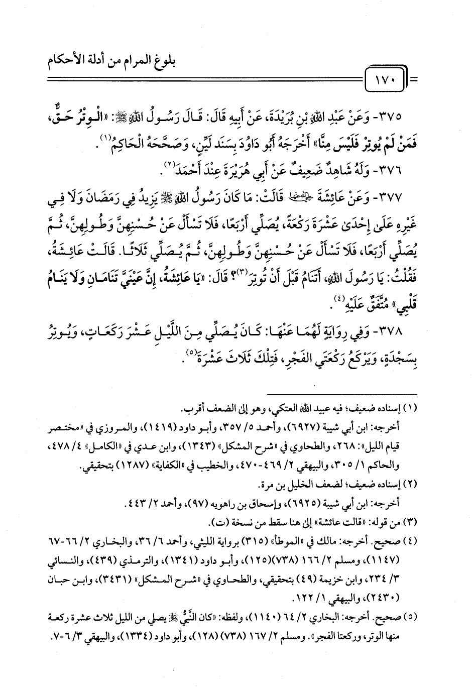 375 - وَعَنْ عَبْدِ اللَّهِ بْنِ بُرَيْدَةَ، عَنْ أَبِيهِ قَالَ: قَالَ رَسُولُ اللَّهِ - صلى الله عليه وسلم -: «الْوِتْرُ حَقٌّ، فَمَنْ لَمْ يُوتِرْ فَلَيْسَ مِنَّا» أَخْرَجَهُ أَبُو دَاوُدَ بِسَنَد لَيِّنٍ، وَصَحَّحَهُ الْحَاكِمُ (¬1).
