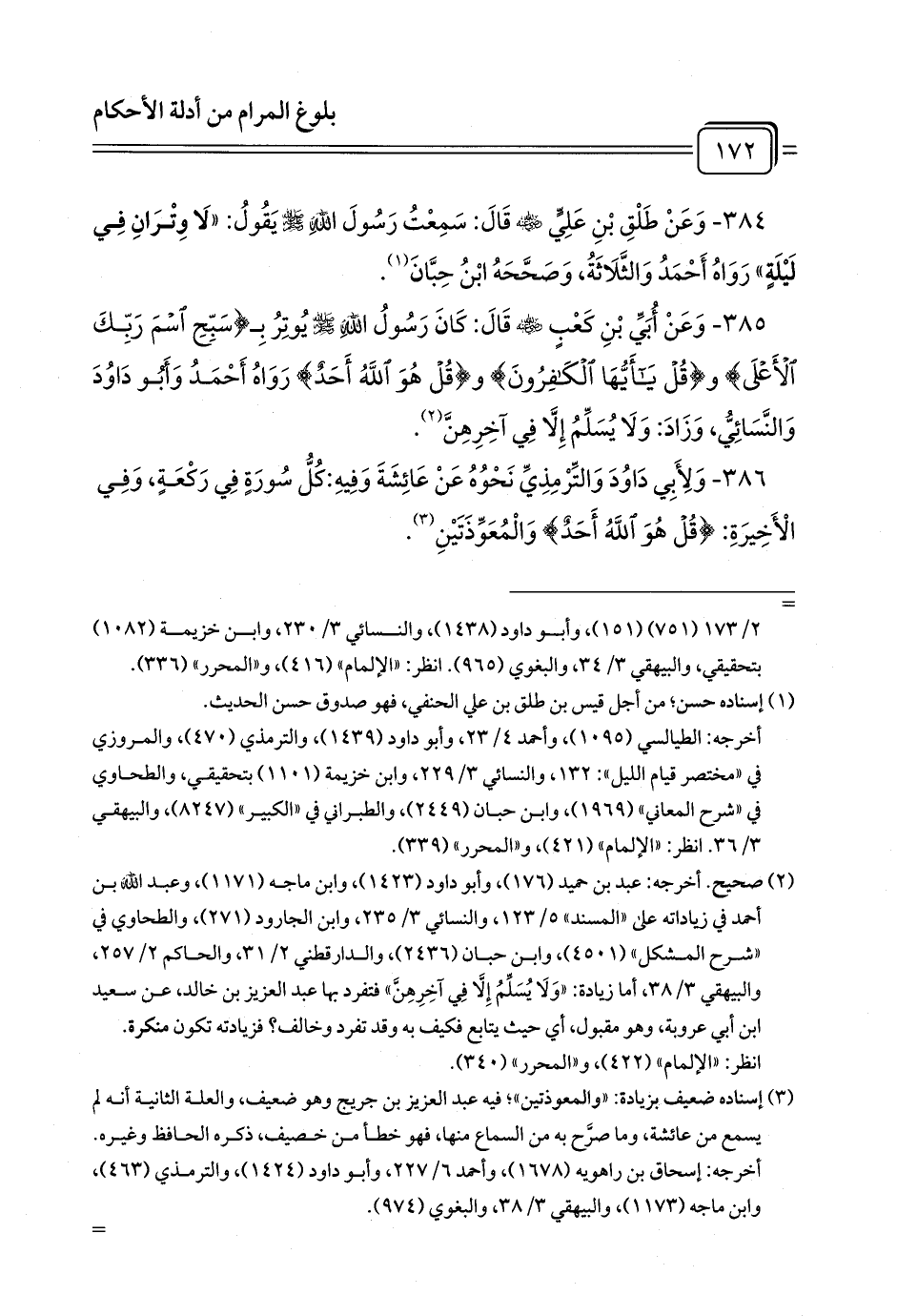 384 - وَعَنْ طَلْقِ بْنِ عَلِيٍّ - رضي الله عنه - قَالَ: سَمِعْتُ رَسُولَ اللَّهِ - صلى الله عليه وسلم - يَقُولُ: «لَا وِتْرَانِ فِي لَيْلَةٍ» رَوَاهُ أَحْمَدُ وَالثَّلَاثَةُ، وَصَحَّحَهُ ابْنُ حِبَّانَ (¬1).