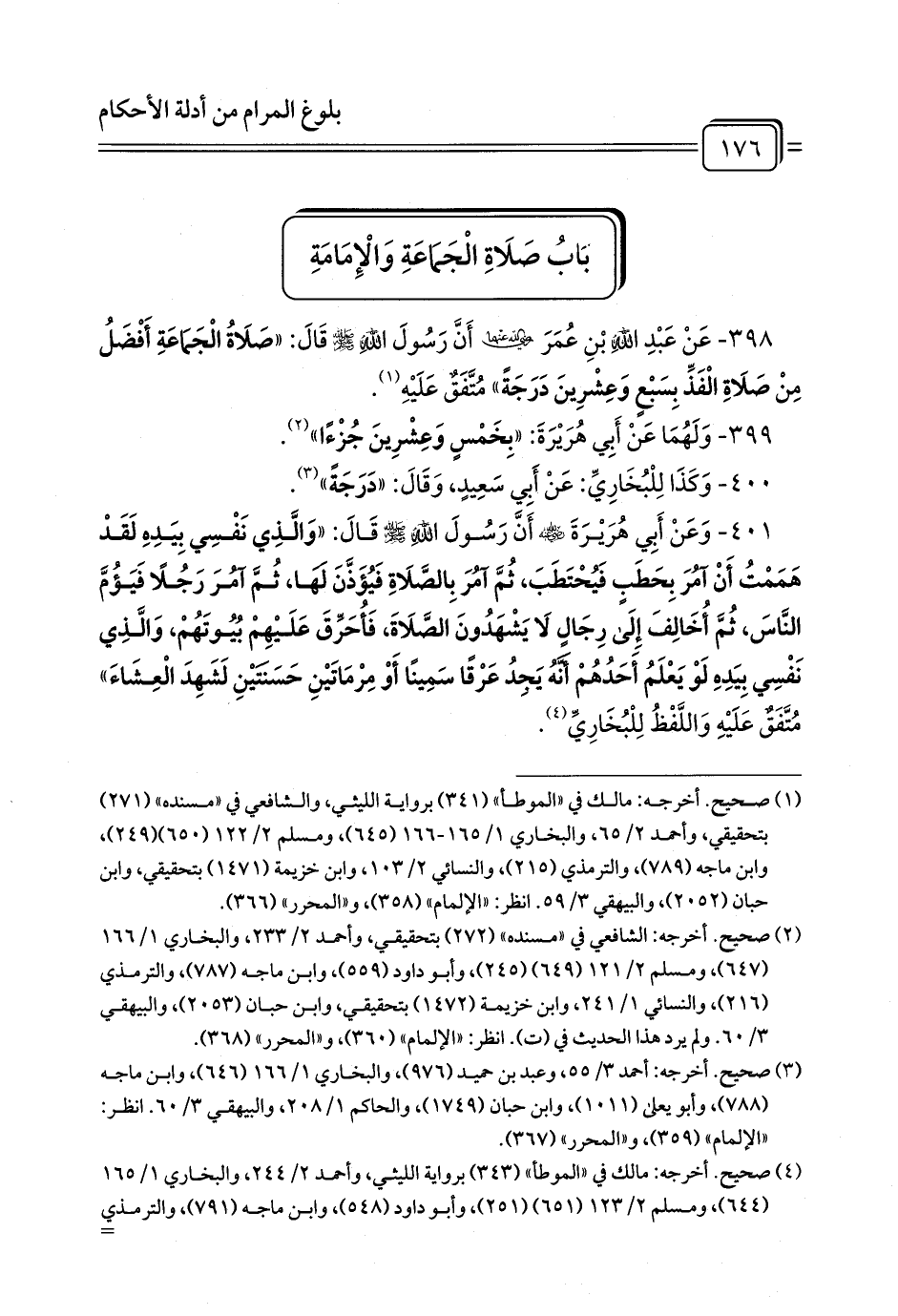 401 - وَعَنْ أَبِي هُرَيْرَةَ - رضي الله عنه - أَنَّ رَسُولَ اللَّهِ - صلى الله عليه وسلم - قَالَ: «وَالَّذِي نَفْسِي بِيَدِهِ لَقَدْ هَمَمْتُ أَنْ آمُرَ بِحَطَبٍ فَيُحْتَطَبَ، ثُمَّ آمُرَ بِالصَّلَاةِ فَيُؤَذَّنَ لَهَا، ثُمَّ آمُرَ رَجُلًا فَيَؤُمَّ النَّاسَ، ثُمَّ أُخَالِفَ إِلَى رِجَالٍ لَا يَشْهَدُونَ الصَّلَاةَ، فَأُحَرِّقَ عَلَيْهِمْ بُيُوتَهُمْ، وَالَّذِي نَفْسِي بِيَدِهِ لَوْ يَعْلَمُ أَحَدُهُمْ أَنَّهُ يَجِدُ عَرْقًا سَمِينًا أَوْ مِرْمَاتَيْنِ حَسَنَتَيْنِ لَشَهِدَ الْعِشَاءَ» مُتَّفَقٌ عَلَيْهِ وَاللَّفْظُ لِلْبُخَارِيِّ (¬1).