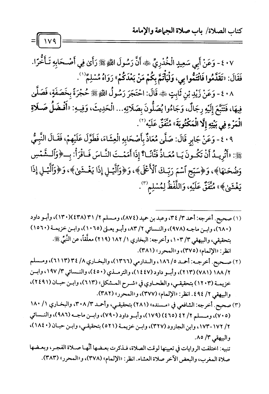 409 - وَعَنْ جَابِرٍ قَالَ: صَلَّى مُعَاذٌ بِأَصْحَابِهِ الْعِشَاءَ، فَطَوَّلَ عَلَيْهِمْ، فَقَالَ النَّبِيُّ - صلى الله عليه وسلم -: «أَتُرِيدُ أَنْ تَكُونَ يَا مُعَاذُ فَتَّانًا? إِذَا أَمَمْتَ النَّاسَ فَاقْرَأْ: بِـ {الشَّمْسِ وَضُحَاهَا}، وَ {سَبِّحِ اسْمَ رَبِّكَ الْأَعْلَى}، وَ {اقْرَأْ بِاسْمِ رَبِّكَ}، وَ {اللَّيْلِ إِذَا يَغْشَى}» مُتَّفَقٌ عَلَيْهِ، وَاللَّفْظُ لِمُسْلِمٍ (¬1).