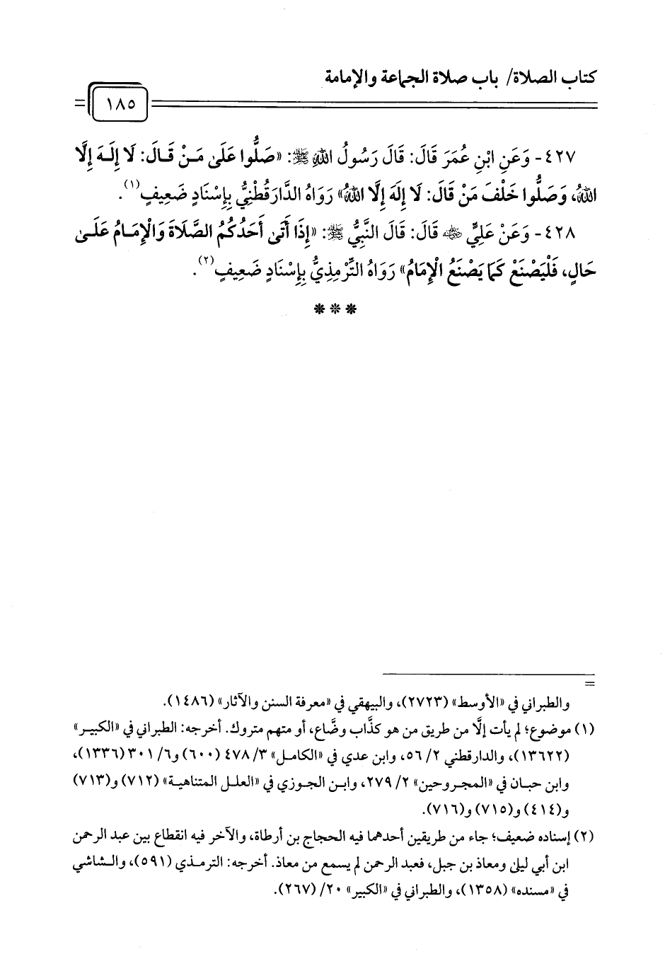 427 - وَعَنِ ابْنِ عُمَرَ قَالَ: قَالَ رَسُولُ اللَّهِ - صلى الله عليه وسلم -: «صَلُّوا عَلَى مَنْ قَالَ: لَا إِلَهَ إِلَّا اللَّهُ، وَصَلُّوا خَلْفَ مَنْ قَالَ: لَا إِلَهَ إِلَّا اللَّهُ» رَوَاهُ الدَّارَقُطْنِيُّ بِإِسْنَادٍ ضَعِيفٍ (¬1).