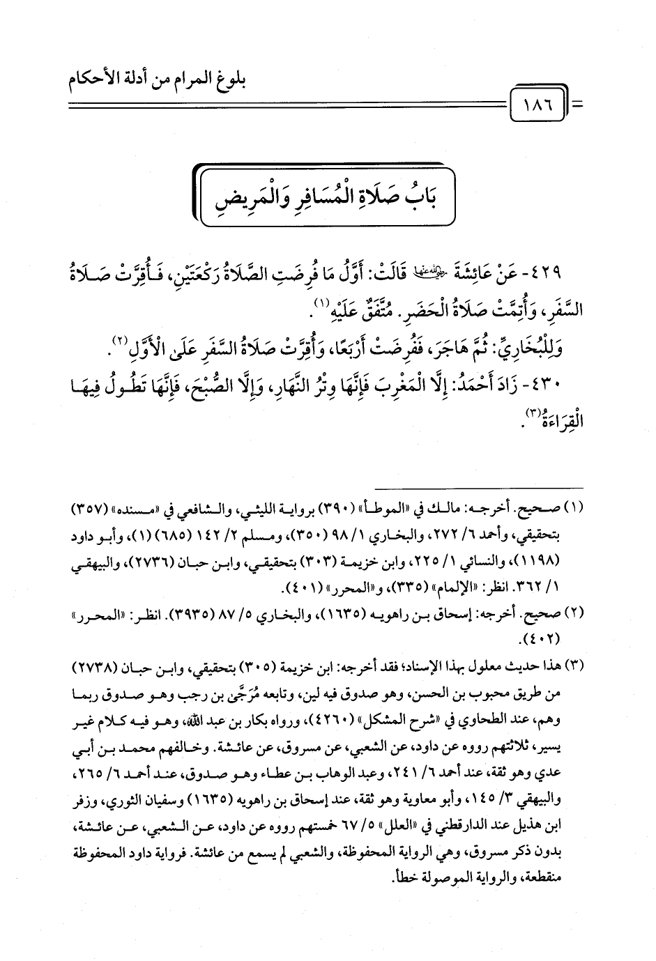429 - عَنْ عَائِشَةَ رَضِيَ اللَّهُ عَنْهَا قَالَتْ: أَوَّلُ مَا فُرِضَتِ الصَّلَاةُ رَكْعَتَيْنِ، فَأُقِرَّتْ صَلَاةُ السَّفَرِ، وَأُتِمَّتْ صَلَاةُ الْحَضَرِ. مُتَّفَقٌ عَلَيْهِ (¬1).