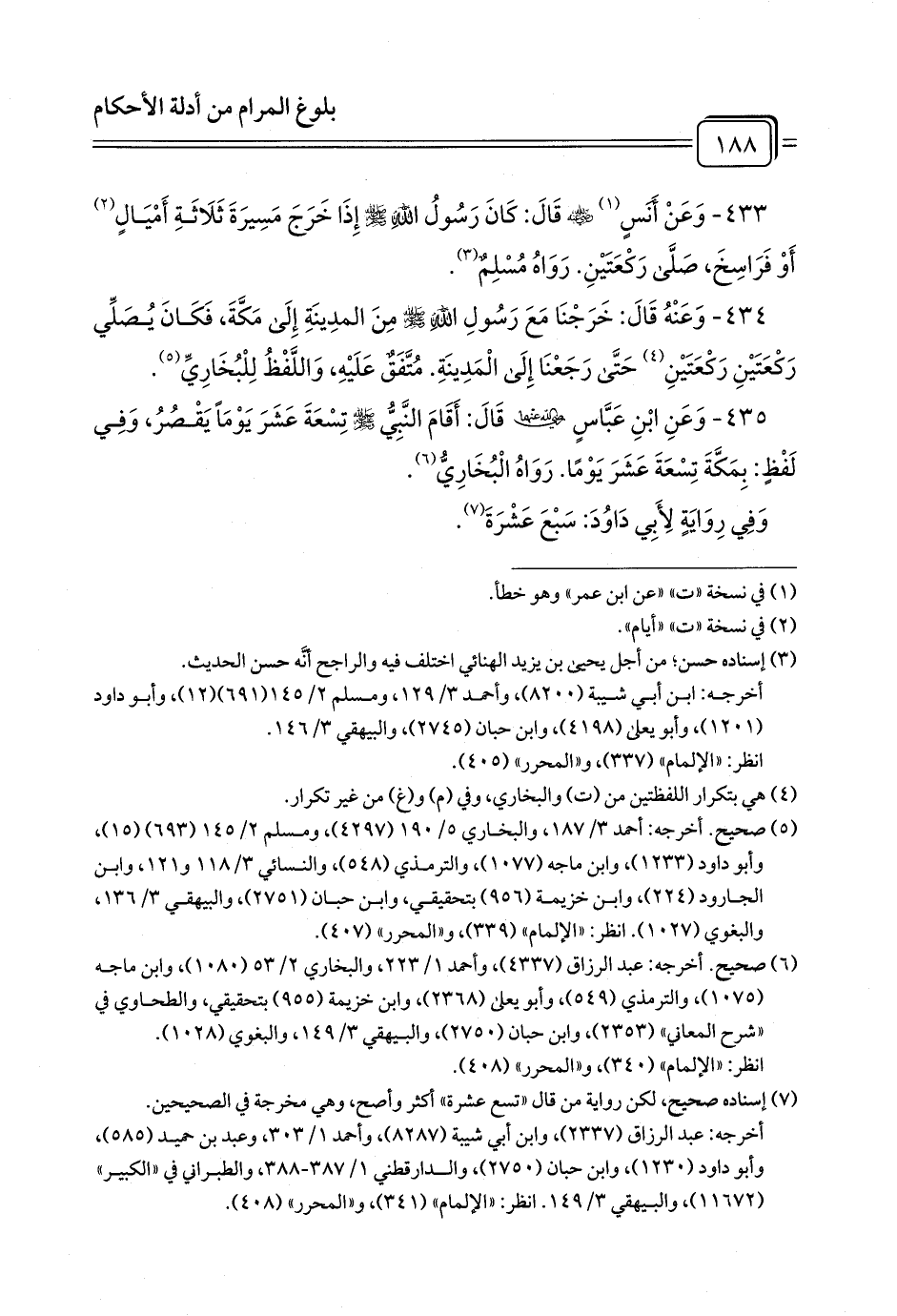 433 - وَعَنْ أَنَسٍ (¬1) - رضي الله عنه - قَالَ: كَانَ رَسُولُ اللَّهِ - صلى الله عليه وسلم - إِذَا خَرَجَ مَسِيرَةَ ثَلَاثَةِ أَمْيَالٍ (¬2) أَوْ فَرَاسِخَ، صَلَّى رَكْعَتَيْنِ. رَوَاهُ مُسْلِمٌ (¬3).
