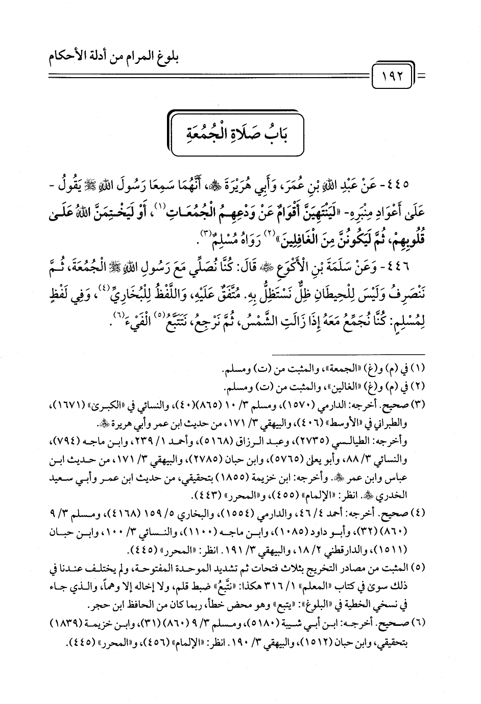 445 - عَنْ عَبْدِ اللَّهِ بْنِ عُمَرَ، وَأَبِي هُرَيْرَةَ - رضي الله عنهم -، أَنَّهُمَا سَمِعَا رَسُولَ اللَّهِ - صلى الله عليه وسلم - يَقُولُ -عَلَى أَعْوَادِ مِنْبَرِهِ- «لَيَنْتَهِيَنَّ أَقْوَامٌ عَنْ وَدْعِهِمُ الْجُمُعَاتِ (¬1)، أَوْ لَيَخْتِمَنَّ اللَّهُ عَلَى قُلُوبِهِمْ، ثُمَّ لَيَكُونُنَّ مِنَ الْغَافِلِينَ (¬2)» رَوَاهُ مُسْلِمٌ (¬3).