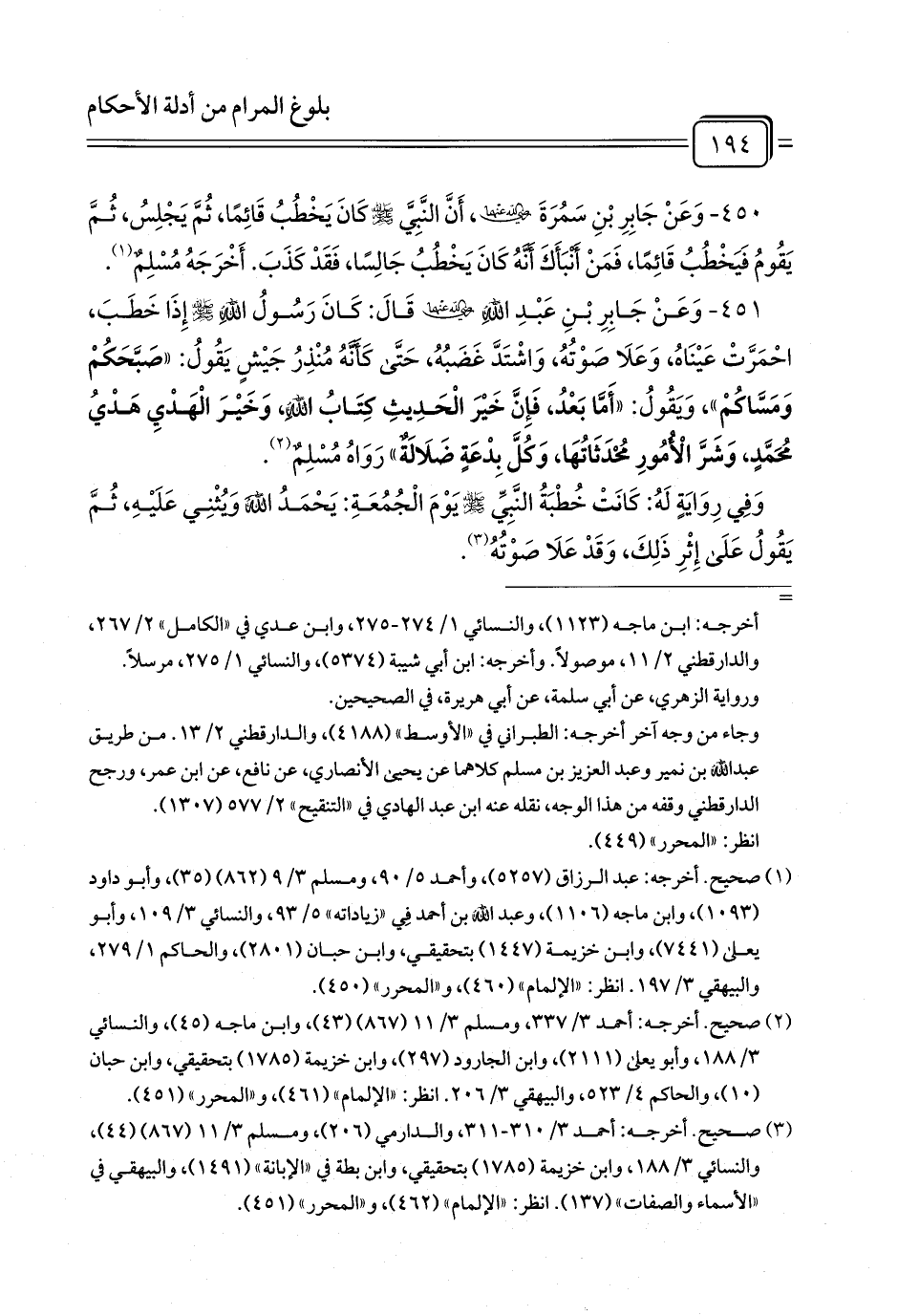 451 - وَعَنْ جَابِرِ بْنِ عَبْدِ اللَّهِ رَضِيَ اللَّهُ عَنْهُمَا قَالَ: كَانَ رَسُولُ اللَّهِ - صلى الله عليه وسلم - إِذَا خَطَبَ، احْمَرَّتْ عَيْنَاهُ، وَعَلَا صَوْتُهُ، وَاشْتَدَّ غَضَبُهُ، حَتَّى كَأَنَّهُ مُنْذِرُ جَيْشٍ يَقُولُ: