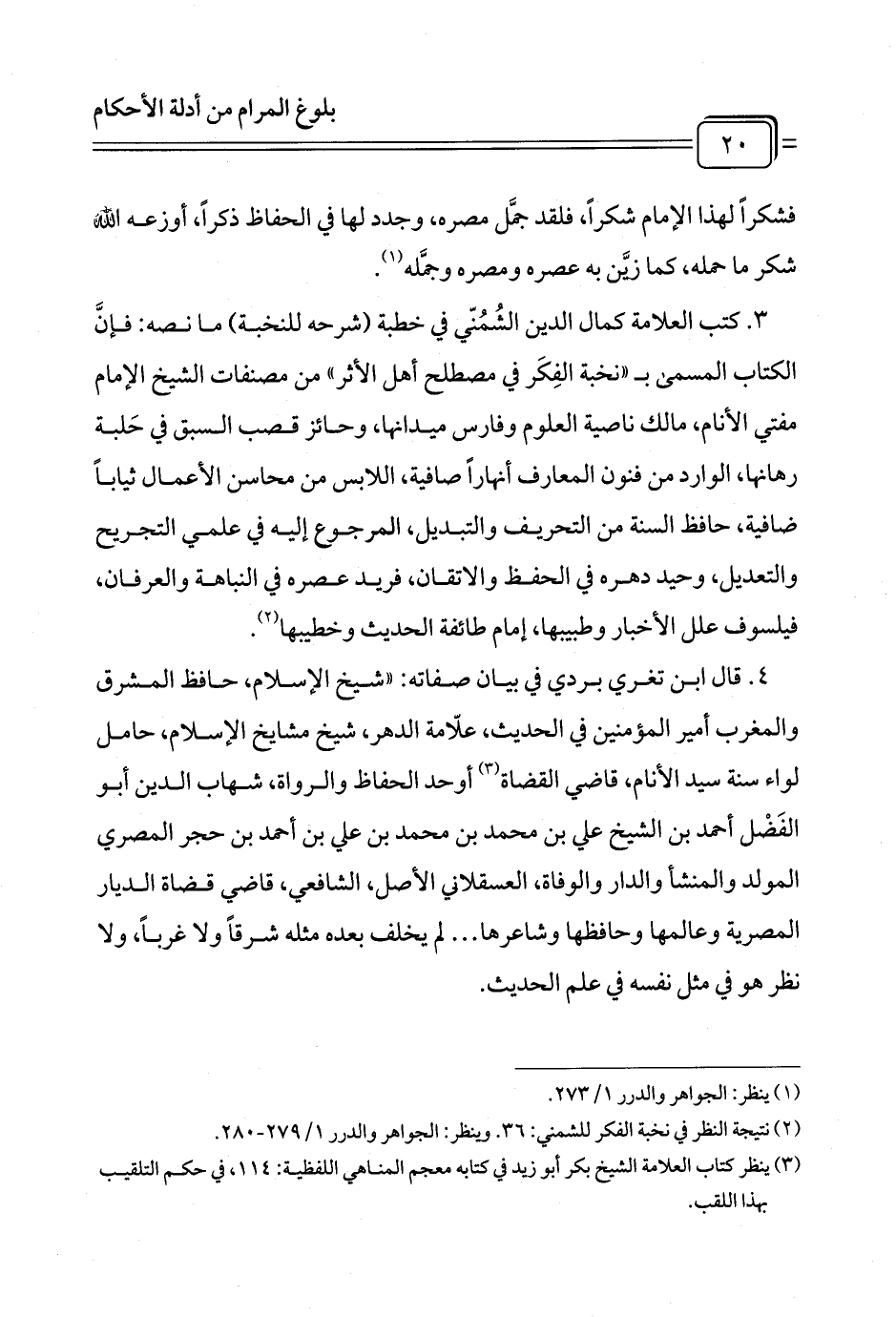 3 - كتب العلامة كمال الدين الشُمُنّي في خطبة (شرحه للنخبة) ما نصه: فإنَّ الكتاب المسمى بـ «نخبة الفِكَر في مصطلح أهل الأثر» من مصنفات الشيخ الإمام مفتي الأنام، مالك ناصية العلوم وفارس ميدانها، وحائز قصب السبق في حَلبة رهانها، الوارد من فنون المعارف أنهاراً صافية، اللابس من محاسن الأعمال ثياباً ضافية، حافظ السنة من التحريف والتبديل، المرجوع إليه في علمي التجريح والتعديل، وحيد دهره في الحفظ والاتقان، فريد عصره في النباهة والعرفان، فيلسوف علل الأخبار وطبيبها، إمام طائفة الحديث وخطيبها (¬2).