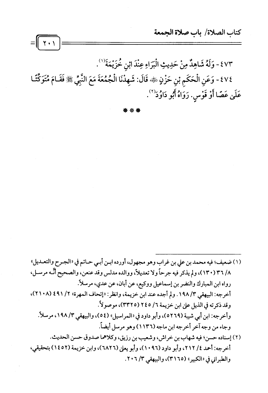 474 - وَعَنِ الْحَكَمِ بْنِ حَزْنٍ - رضي الله عنه - قَالَ: شَهِدْنَا الْجُمُعَةَ مَعَ النَّبِيِّ - صلى الله عليه وسلم - فَقَامَ مُتَوَكِّئًا عَلَى عَصًا أَوْ قَوْسٍ. رَوَاهُ أَبُو دَاوُدَ (¬1).