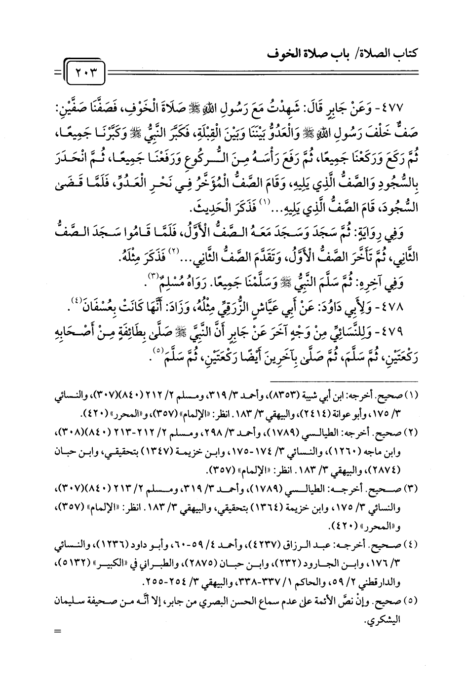 477 - وَعَنْ جَابِرٍ قَالَ: شَهِدْتُ مَعَ رَسُولِ اللَّهِ - صلى الله عليه وسلم - صَلَاةَ الْخَوْفِ، فَصَفَّنَا صَفَّيْنِ: صَفٌّ خَلْفَ رَسُولِ اللَّهِ - صلى الله عليه وسلم - وَالْعَدُوُّ بَيْنَنَا وَبَيْنَ الْقِبْلَةِ، فَكَبَّرَ النَّبِيُّ - صلى الله عليه وسلم - وَكَبَّرْنَا جَمِيعًا، ثُمَّ رَكَعَ وَرَكَعْنَا جَمِيعًا، ثُمَّ رَفَعَ رَأْسَهُ مِنَ الُّركُوعِ وَرَفَعْنَا جَمِيعًا، ثُمَّ انْحَدَرَ بِالسُّجُودِ وَالصَّفُّ الَّذِي يَلِيهِ، وَقَامَ الصَّفُّ الْمُؤَخَّرُ فِي نَحْرِ الْعَدُوِّ، فَلَمَّا قَضَى السُّجُودَ، قَامَ الصَّفُّ الَّذِي يَلِيهِ ... (¬1)