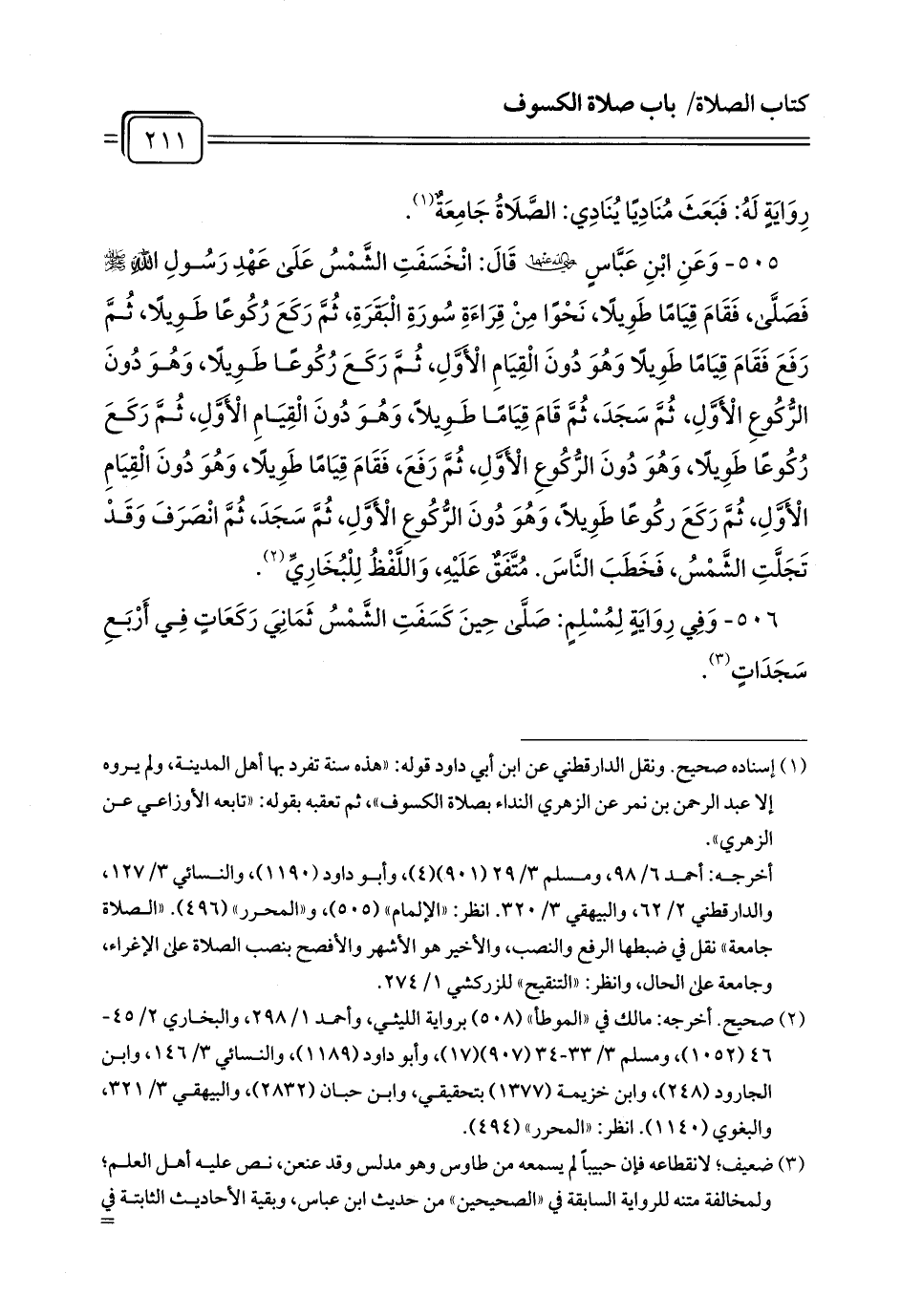 (¬1) إسناده صحيح. ونقل الدارقطني عن ابن أبي داود قوله: «هذه سنة تفرد بها أهل المدينة، ولم يروه إلا عبد الرحمن بن نمر عن الزهري النداء بصلاة الكسوف»، ثم تعقبه بقوله: «تابعه الأوزاعي عن الزهري».