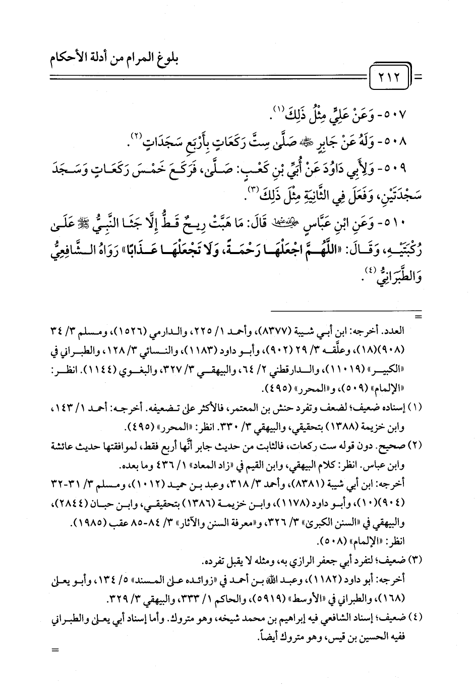 509 - وَلِأَبِي دَاوُدَ عَنْ أُبَيِّ بْنِ كَعْبٍ: صَلَّى، فَرَكَعَ خَمْسَ رَكَعَاتٍ وَسَجَدَ سَجْدَتَيْنِ، وَفَعَلَ فِي الثَّانِيَةِ مِثْلَ ذَلِكَ (¬1).