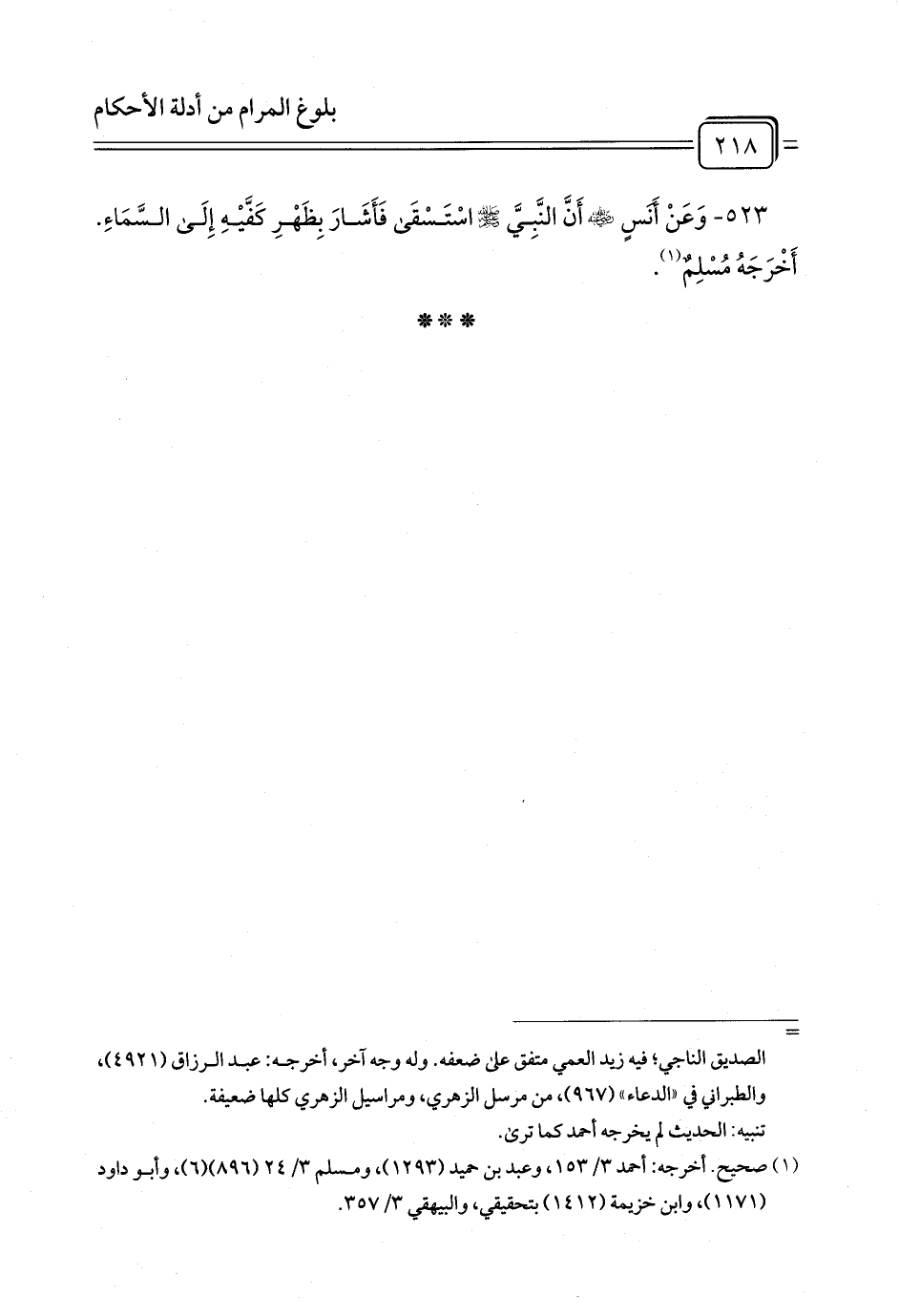 523 - وَعَنْ أَنَسٍ - رضي الله عنه - أَنَّ النَّبِيَّ - صلى الله عليه وسلم - اسْتَسْقَى فَأَشَارَ بِظَهْرِ كَفَّيْهِ إِلَى السَّمَاءِ. أَخْرَجَهُ مُسْلِمٌ (¬1).
