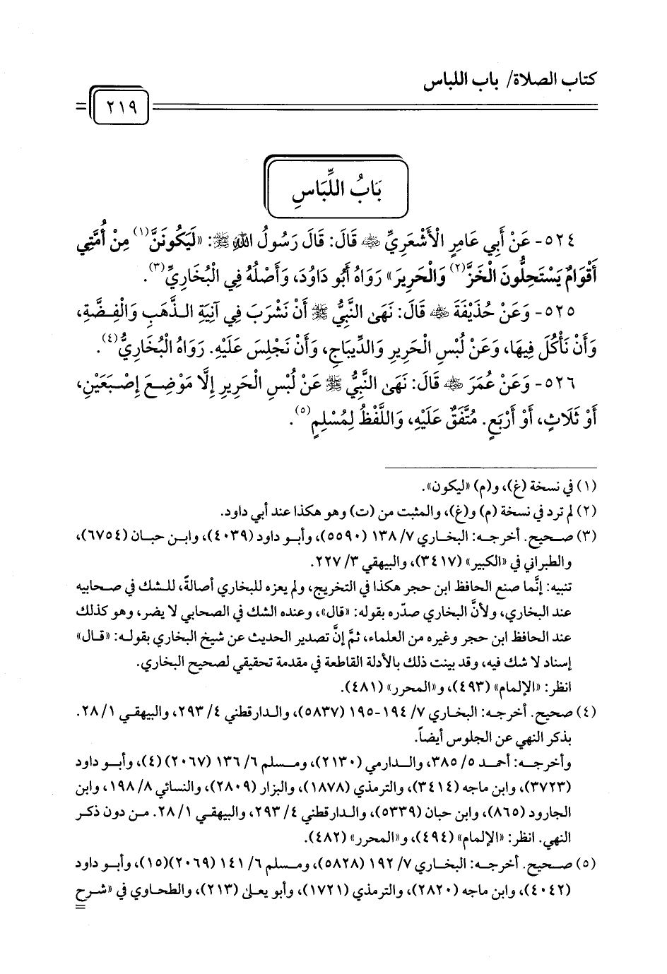 524 - عَنْ أَبِي عَامِرٍ الْأَشْعَرِيِّ - رضي الله عنه - قَالَ: قَالَ رَسُولُ اللَّهِ - صلى الله عليه وسلم -: «لَيَكُونَنَّ (¬1) مِنْ أُمَّتِي أَقْوَامٌ يَسْتَحِلُّونَ الْخَزَّ (¬2) وَالْحَرِيرَ» رَوَاهُ أَبُو دَاوُدَ، وَأَصْلُهُ فِي الْبُخَارِيِّ (¬3).