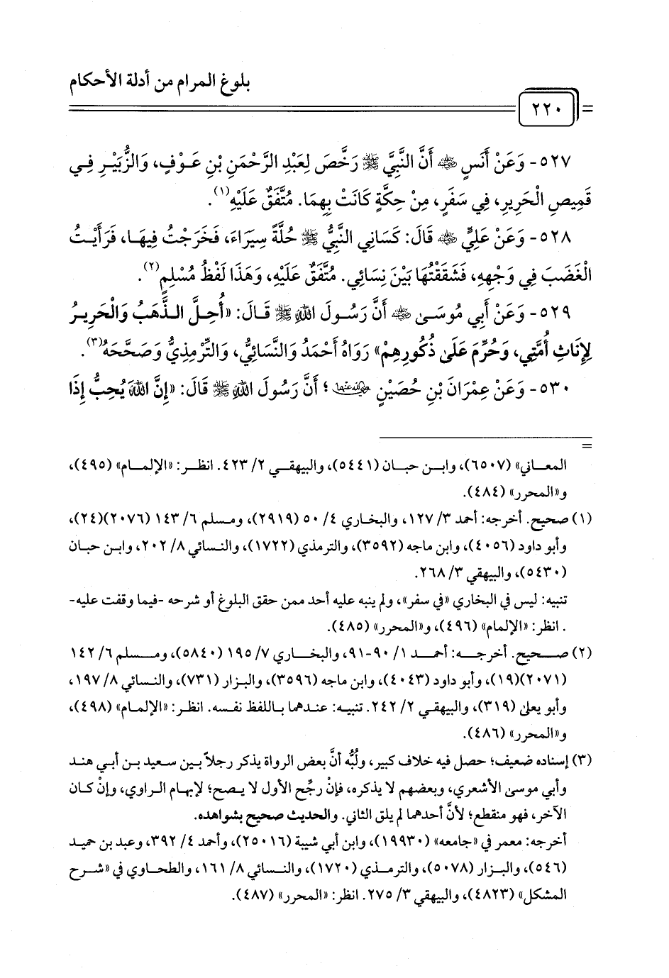 529 - وَعَنْ أَبِي مُوسَى - رضي الله عنه - أَنَّ رَسُولَ اللَّهِ - صلى الله عليه وسلم - قَالَ: «أُحِلَّ الذَّهَبُ وَالْحَرِيرُ لِإِنَاثِ أُمَّتِي، وَحُرِّمَ عَلَى ذُكُورِهِمْ» رَوَاهُ أَحْمَدُ وَالنَّسَائِيُّ، وَالتِّرْمِذِيُّ وَصَحَّحَهُ (¬1).