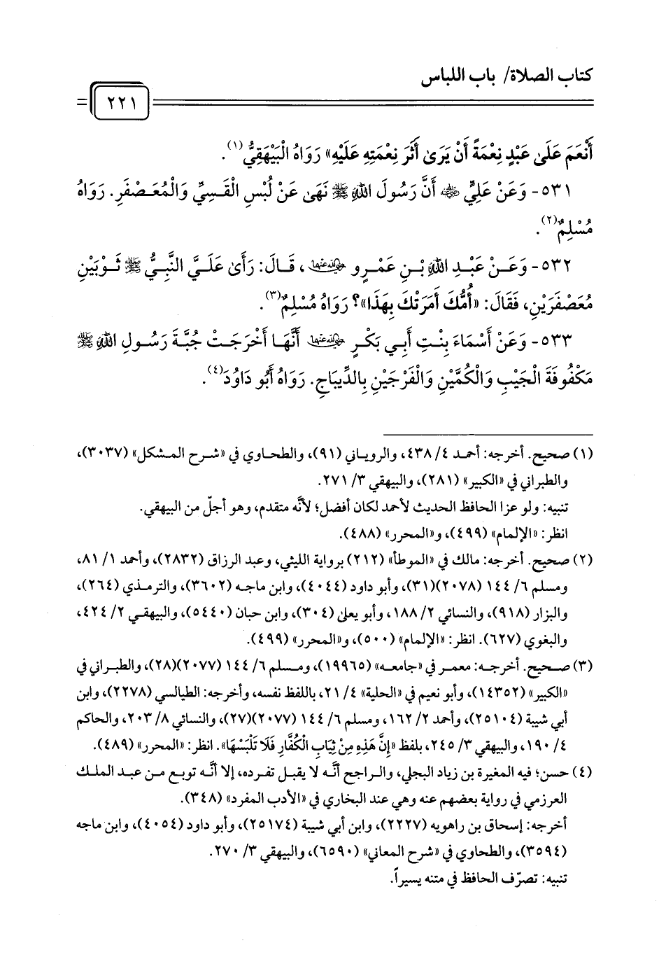 532 - وَعَنْ عَبْدِ اللَّهِ بْنِ عَمْرٍو رَضِيَ اللَّهُ عَنْهُمَا، قَالَ: رَأَى عَلَيَّ النَّبِيُّ - صلى الله عليه وسلم - ثَوْبَيْنِ مُعَصْفَرَيْنِ، فَقَالَ: «أُمُّكَ أَمَرَتْكَ بِهَذَا» ? رَوَاهُ مُسْلِمٌ (¬1).