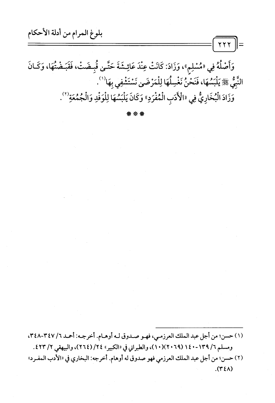 وَزَادَ الْبُخَارِيُّ فِي «الْأَدَبِ الْمُفْرَدِ» وَكَانَ يَلْبَسُهَا لِلْوَفْدِ وَالْجُمُعَةِ (¬2).