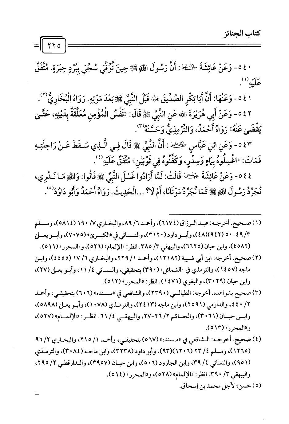 540 - وَعَنْ عَائِشَةَ رَضِيَ اللَّهُ عَنْهَا: أَنَّ رَسُولَ اللَّهِ - صلى الله عليه وسلم - حِينَ تُوُفِّيَ سُجِّيَ بِبُرْدٍ حِبَرَةٍ. مُتَّفَقٌ عَلَيْهِ (¬1).