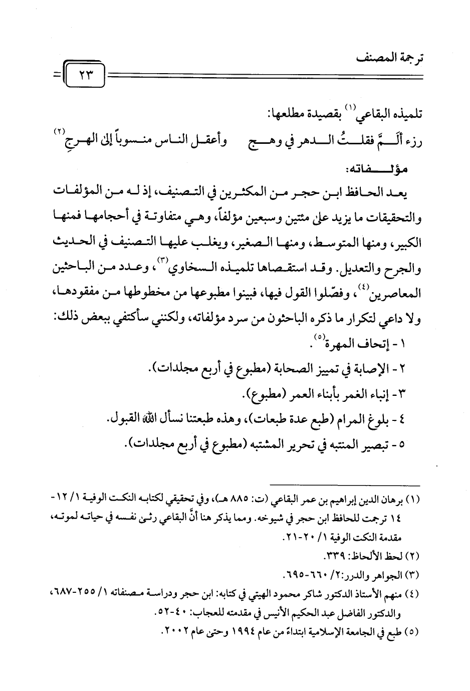 (¬4) منهم الأستاذ الدكتور شاكر محمود الهيتي في كتابه: ابن حجر ودراسة مصنفاته 1/ 255 - 687، والدكتور الفاضل عبد الحكيم الأنيس في مقدمته للعجاب: 40 - 52.