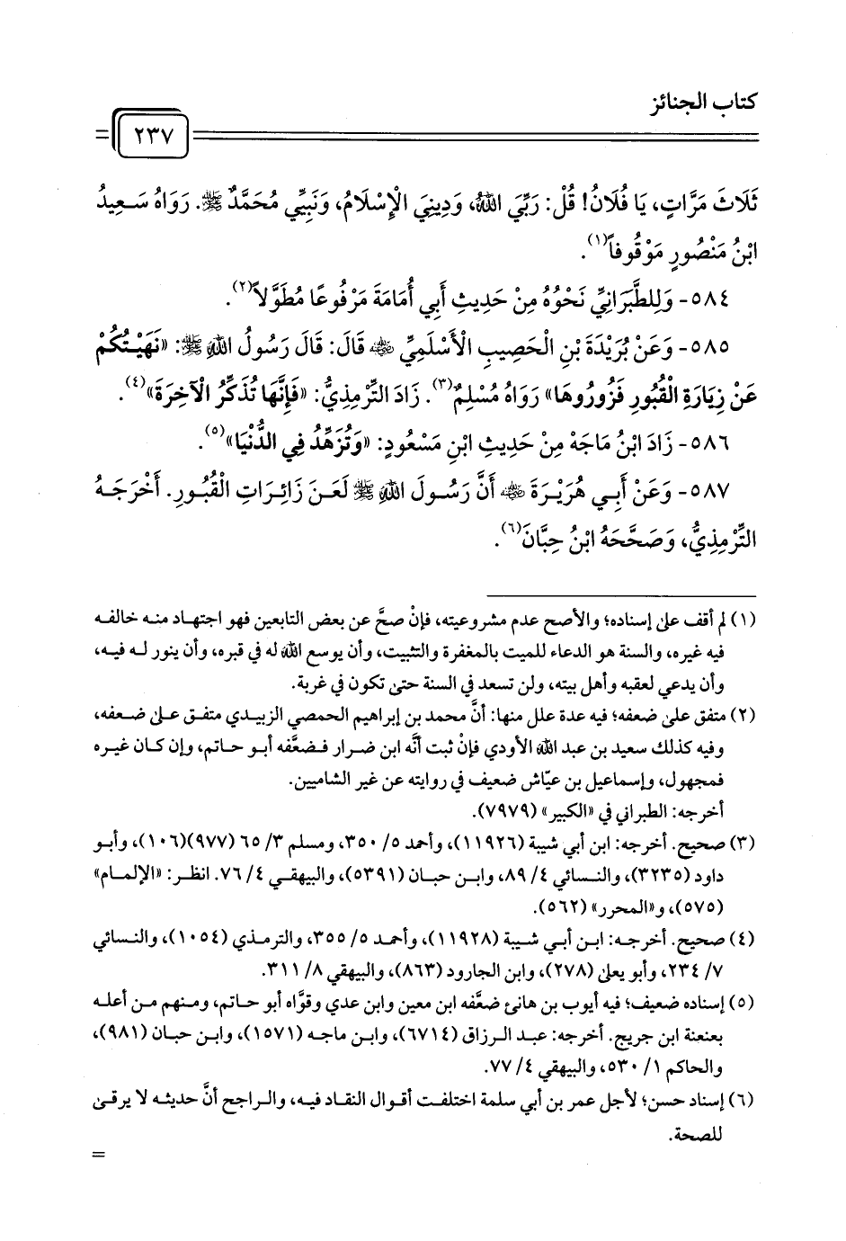 587 - وَعَنْ أَبِي هُرَيْرَةَ - رضي الله عنه - أَنَّ رَسُولَ اللَّهِ - صلى الله عليه وسلم - لَعَنَ زَائِرَاتِ الْقُبُورِ. أَخْرَجَهُ التِّرْمِذِيُّ، وَصَحَّحَهُ ابْنُ حِبَّانَ (¬1).