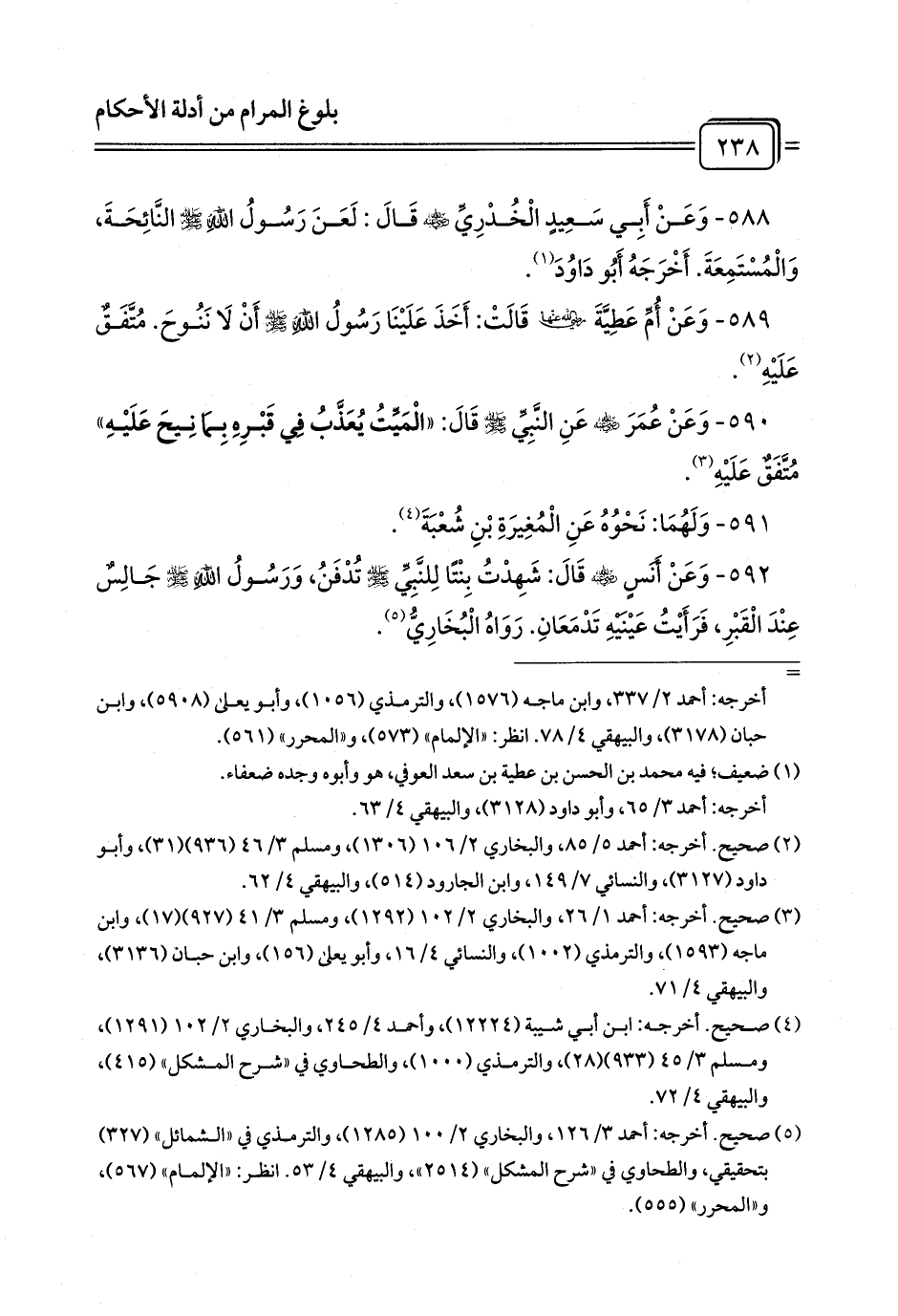 589 - وَعَنْ أُمِّ عَطِيَّةَ رَضِيَ اللَّهُ عَنْهَا قَالَتْ: أَخَذَ عَلَيْنَا رَسُولُ اللَّهِ - صلى الله عليه وسلم - أَنْ لَا نَنُوحَ. مُتَّفَقٌ عَلَيْهِ (¬1).