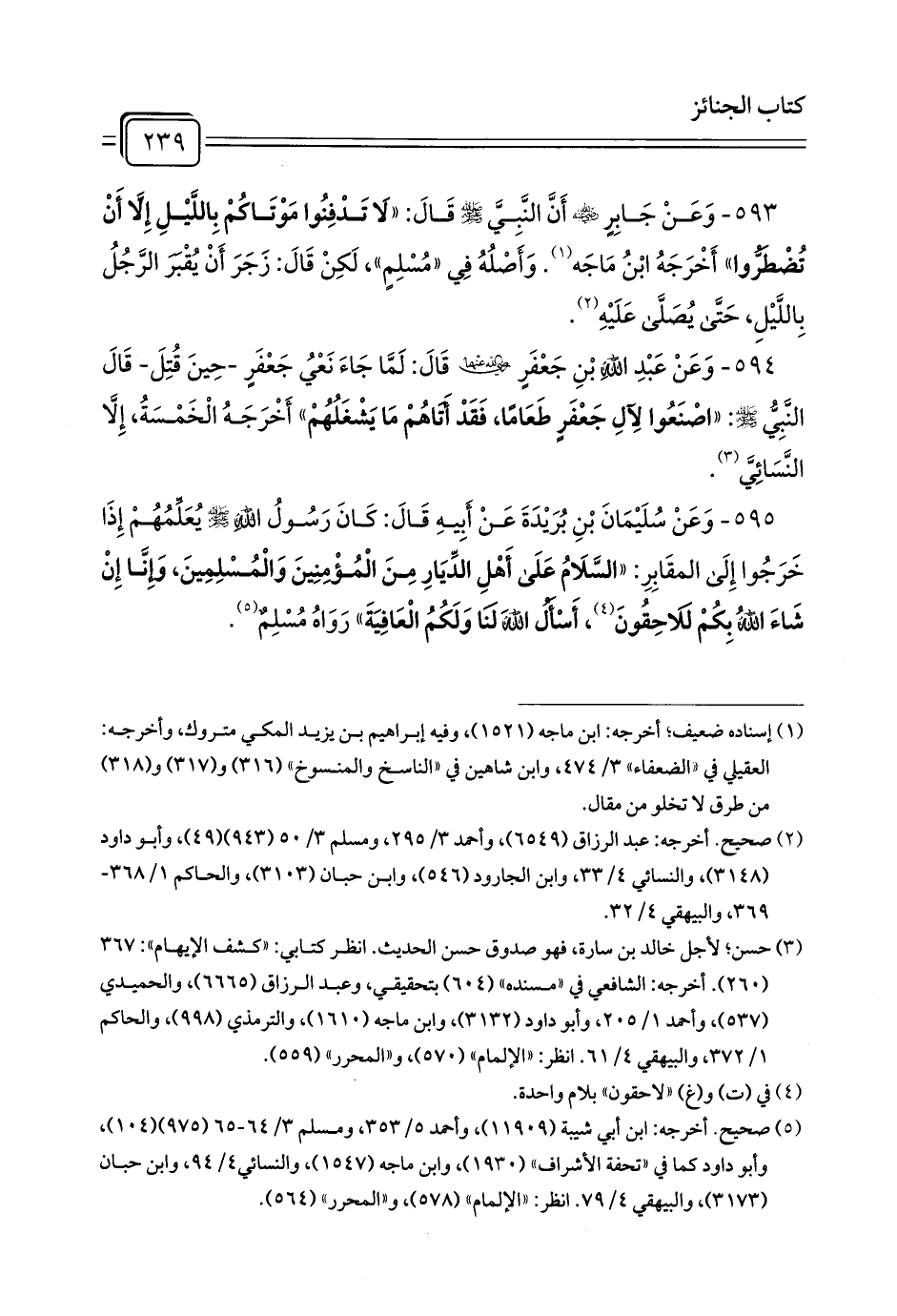 594 - وَعَنْ عَبْدِ اللَّهِ بْنِ جَعْفَرٍ رَضِيَ اللَّهُ عَنْهُمَا قَالَ: لَمَّا جَاءَ نَعْيُ جَعْفَرٍ -حِينَ قُتِلَ- قَالَ النَّبِيُّ - صلى الله عليه وسلم -: «اصْنَعُوا لِآلِ جَعْفَرٍ طَعَامًا، فَقَدْ أَتَاهُمْ مَا يَشْغَلُهُمْ» أَخْرَجَهُ الْخَمْسَةُ، إِلَّا النَّسَائِيَّ (¬1).