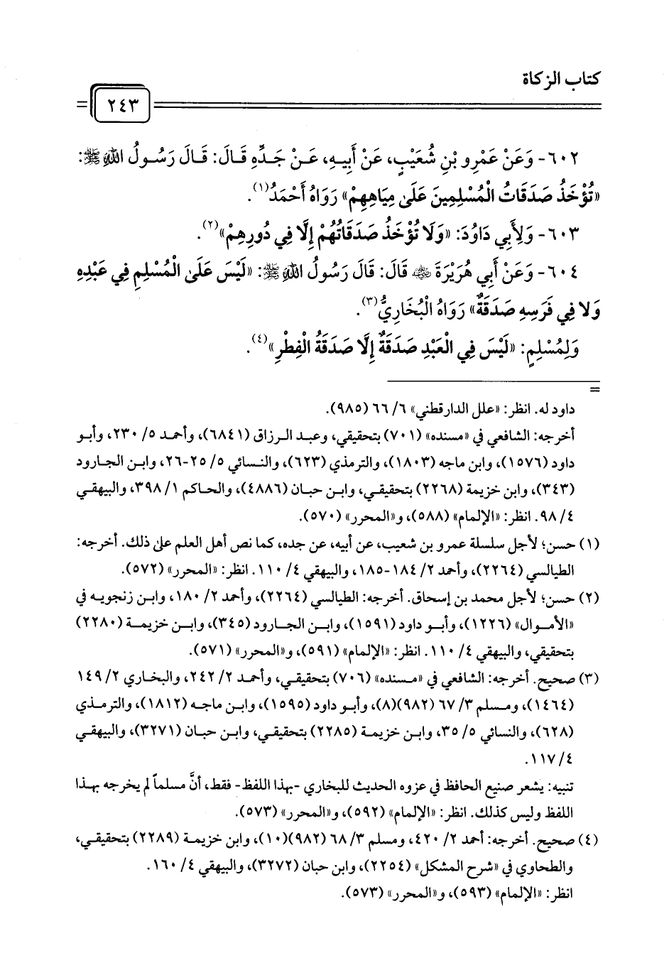 603 - وَلِأَبِي دَاوُدَ: «وَلَا تُؤْخَذُ صَدَقَاتُهُمْ إِلَّا فِي دُورِهِمْ» (¬1).
