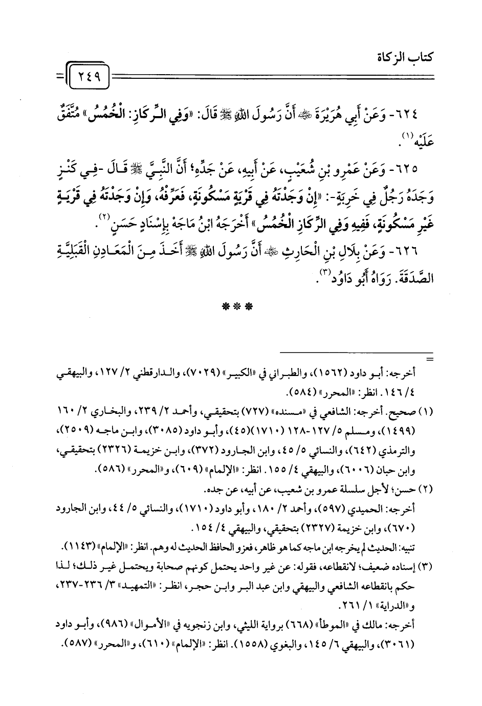 624 - وَعَنْ أَبِي هُرَيْرَةَ - رضي الله عنه - أَنَّ رَسُولَ اللَّهِ - صلى الله عليه وسلم - قَالَ: «وَفِي الِّركَازِ: الْخُمُسُ» مُتَّفَقٌ عَلَيْه (¬1).