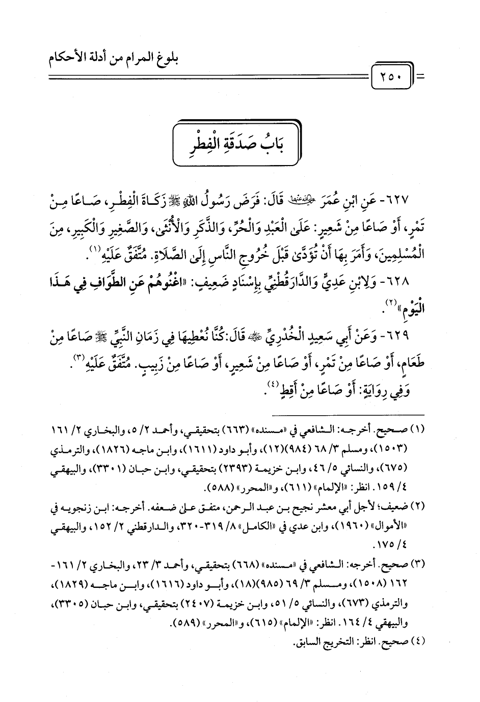 627 - عَنِ ابْنِ عُمَرَ رَضِيَ اللَّهُ عَنْهُمَا قَالَ: فَرَضَ رَسُولُ اللَّهِ - صلى الله عليه وسلم - زَكَاةَ الْفِطْرِ، صَاعًا مِنْ تَمْرٍ، أَوْ صَاعًا مِنْ شَعِيرٍ: عَلَى الْعَبْدِ وَالْحُرِّ، وَالذَّكَرِ وَالْأُنْثَى، وَالصَّغِيرِ وَالْكَبِيرِ، مِنَ الْمُسْلِمِينَ، وَأَمَرَ بِهَا أَنْ تُؤَدَّى قَبْلَ خُرُوجِ النَّاسِ إِلَى الصَّلَاةِ. مُتَّفَقٌ عَلَيْهِ (¬1).