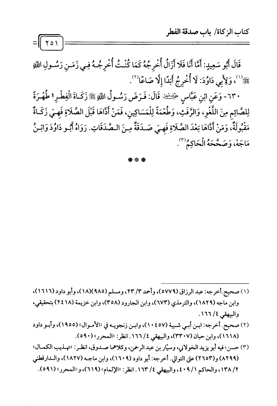 630 - وَعَنِ ابْنِ عَبَّاسٍ رَضِيَ اللَّهُ عَنْهُمَا قَالَ: فَرَضَ رَسُولُ اللَّهِ - صلى الله عليه وسلم - زَكَاةَ الْفِطْرِ; طُهْرَةً لِلصَّائِمِ مِنَ اللَّغْوِ، وَالرَّفَثِ، وَطُعْمَةً لِلْمَسَاكِينِ، فَمَنْ أَدَّاهَا قَبْلَ الصَّلَاةِ فَهِيَ زَكَاةٌ مَقْبُولَةٌ، وَمَنْ أَدَّاهَا بَعْدَ الصَّلَاةِ فَهِيَ صَدَقَةٌ مِنَ الصَّدَقَاتِ. رَوَاهُ أَبُو دَاوُدَ وَابْنُ مَاجَهْ، وَصَحَّحَهُ الْحَاكِمُ (¬1).