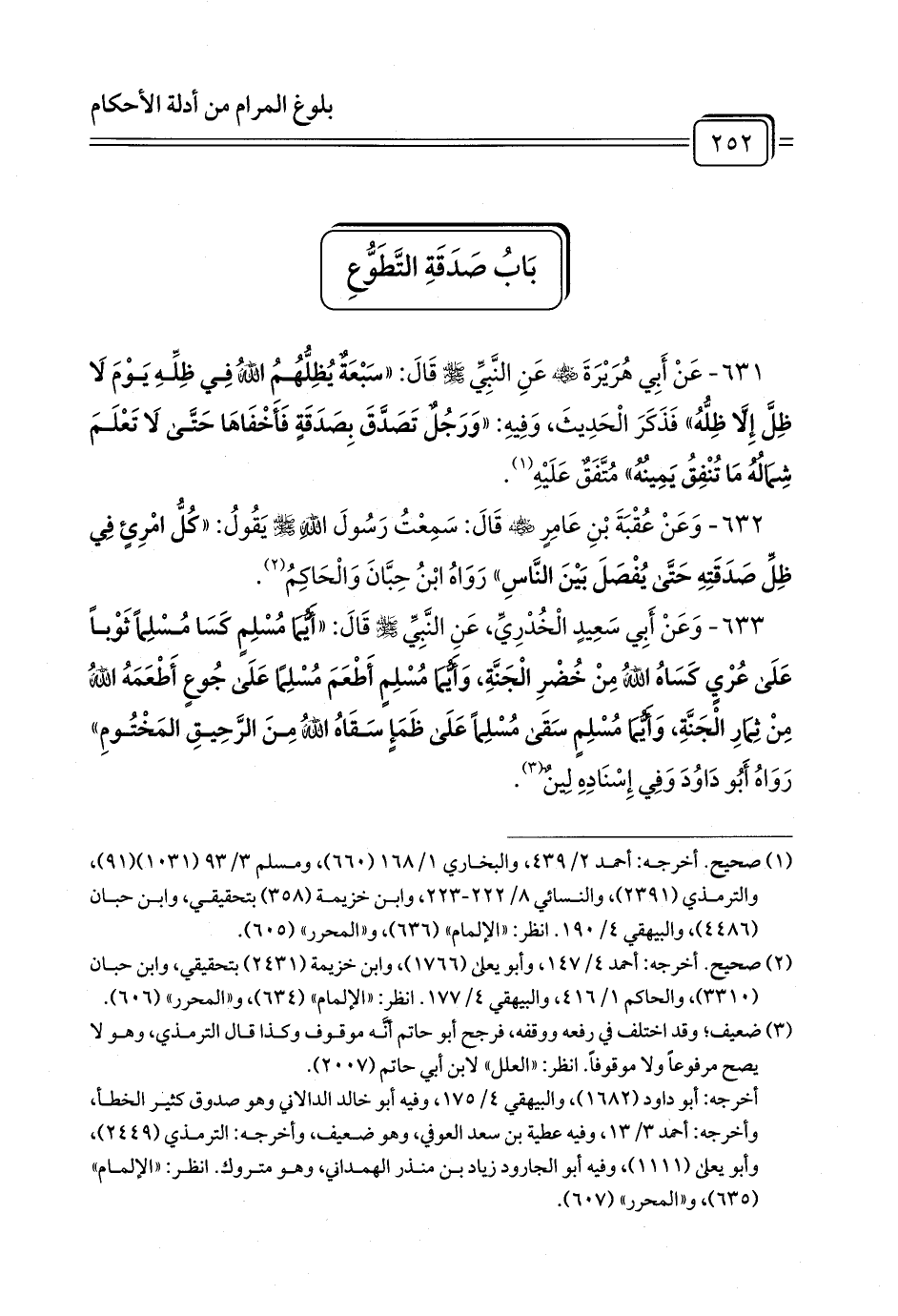 632 - وَعَنْ عُقْبَةَ بْنِ عَامِرٍ - رضي الله عنه - قَالَ: سَمِعْتُ رَسُولَ اللَّهِ - صلى الله عليه وسلم - يَقُولُ: «كُلُّ امْرِئٍ فِي ظِلِّ صَدَقَتِهِ حَتَّى يُفْصَلَ بَيْنَ النَّاسِ» رَوَاهُ ابْنُ حِبَّانَ وَالْحَاكِمُ (¬1).