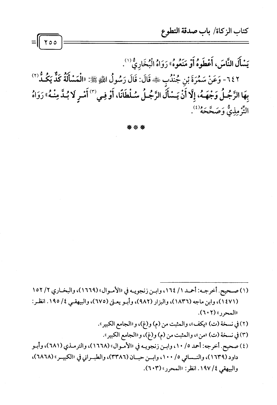 642 - وَعَنْ سَمُرَةَ بْنِ جُنْدُبٍ - رضي الله عنه - قَالَ: قَالَ رَسُولُ اللَّهِ - صلى الله عليه وسلم -: «الْمَسْأَلَةُ كَدٌّ يَكُدُّ (¬1) بِهَا الرَّجُلُ وَجْهَهُ، إِلَّا أَنْ يَسْأَلَ الرَّجُلُ سُلْطَانًا، أَوْ فِي (¬2) أَمْرٍ لَا بُدَّ مِنْهُ» رَوَاهُ التِّرْمِذِيُّ وَصَحَّحَهُ (¬3).