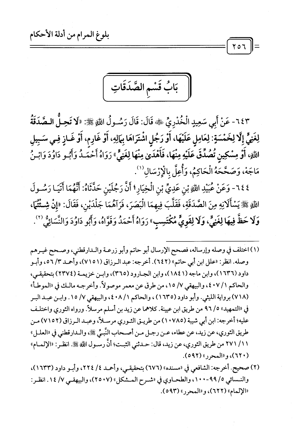 643 - عَنْ أَبِي سَعِيدٍ الْخُدْرِيِّ - رضي الله عنه - قَالَ: قَالَ رَسُولُ اللَّهِ - صلى الله عليه وسلم -: «لَا تَحِلُّ الصَّدَقَةُ لِغَنِيٍّ إِلَّا لِخَمْسَةٍ: لِعَامِلٍ عَلَيْهَا، أَوْ رَجُلٍ اشْتَرَاهَا بِمَالِهِ، أَوْ غَارِمٍ، أَوْ غَازٍ فِي سَبِيلِ اللَّهِ، أَوْ مِسْكِينٍ تُصُدِّقَ عَلَيْهِ مِنْهَا، فَأَهْدَى مِنْهَا لِغَنِيٍّ» رَوَاهُ أَحْمَدُ وَأَبُو دَاوُدَ وَابْنُ مَاجَهْ، وَصَحَّحَهُ الْحَاكِمُ، وَأُعِلَّ بِالْإِرْسَالِ (¬1).