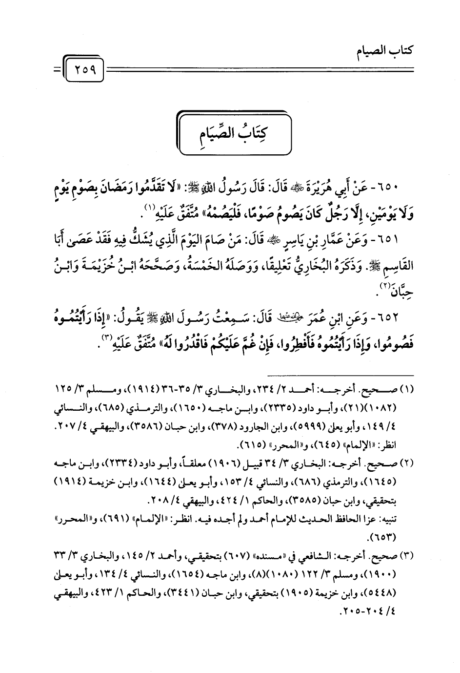 650 - عَنْ أَبِي هُرَيْرَةَ - رضي الله عنه - قَالَ: قَالَ رَسُولُ اللَّهِ - صلى الله عليه وسلم -: «لَا تَقَدَّمُوا رَمَضَانَ بِصَوْمِ يَوْمٍ وَلَا يَوْمَيْنِ، إِلَّا رَجُلٌ كَانَ يَصُومُ صَوْمًا، فَلْيَصُمْهُ» مُتَّفَقٌ عَلَيْهِ (¬1).